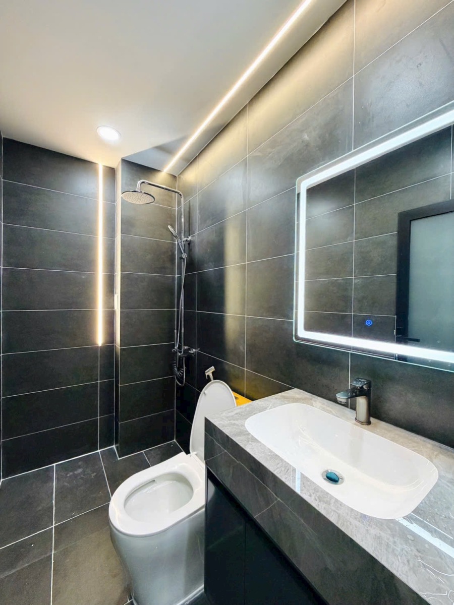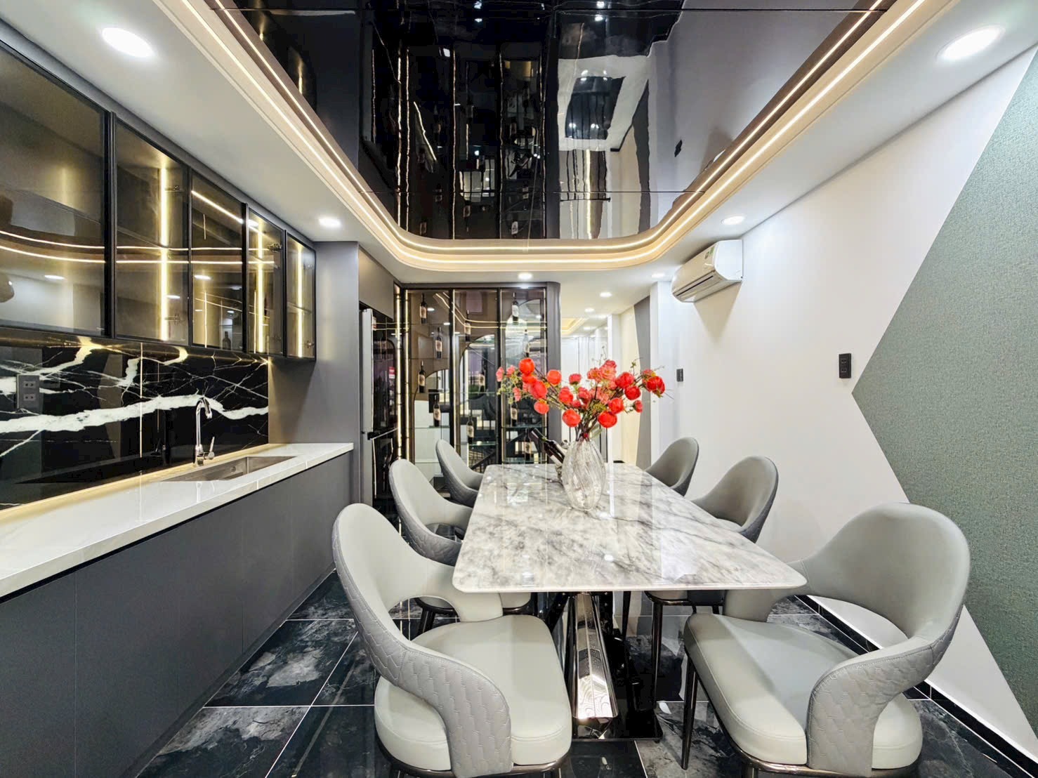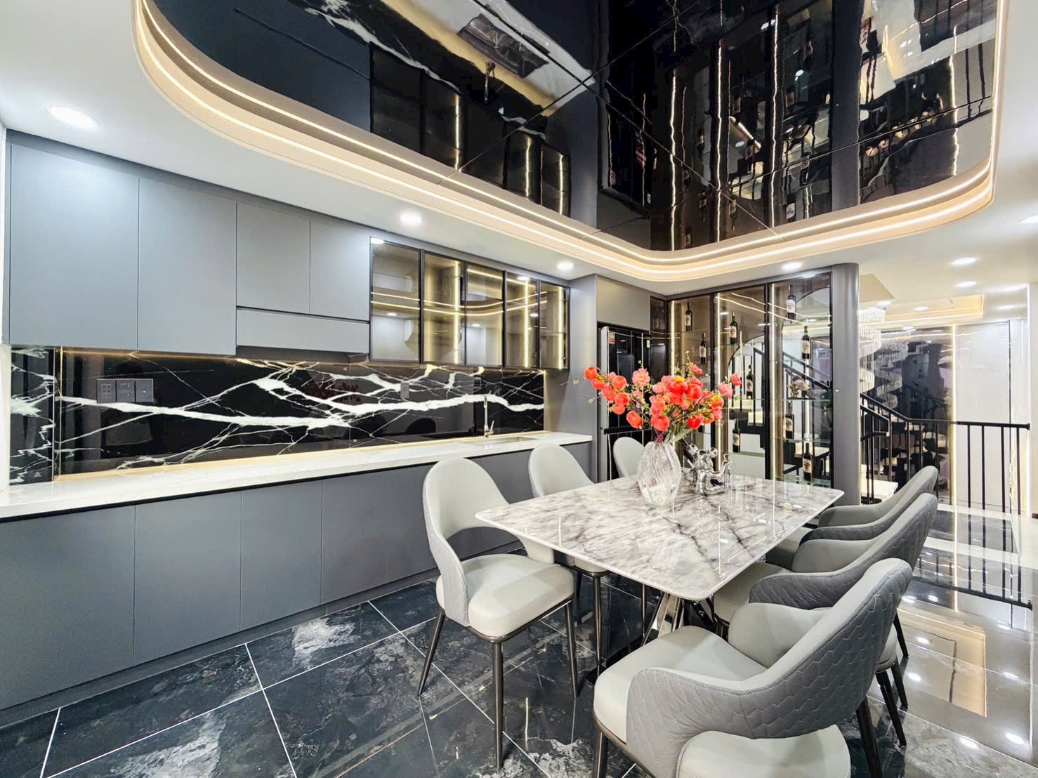 - Phòng bếp: Bếp ốp đá marble đen vân trắng, tủ bếp acrylic cao cấp, trang bị đầy đủ thiết bị hiện đại như bếp âm, hút mùi, máy lọc nước, tủ lạnh.