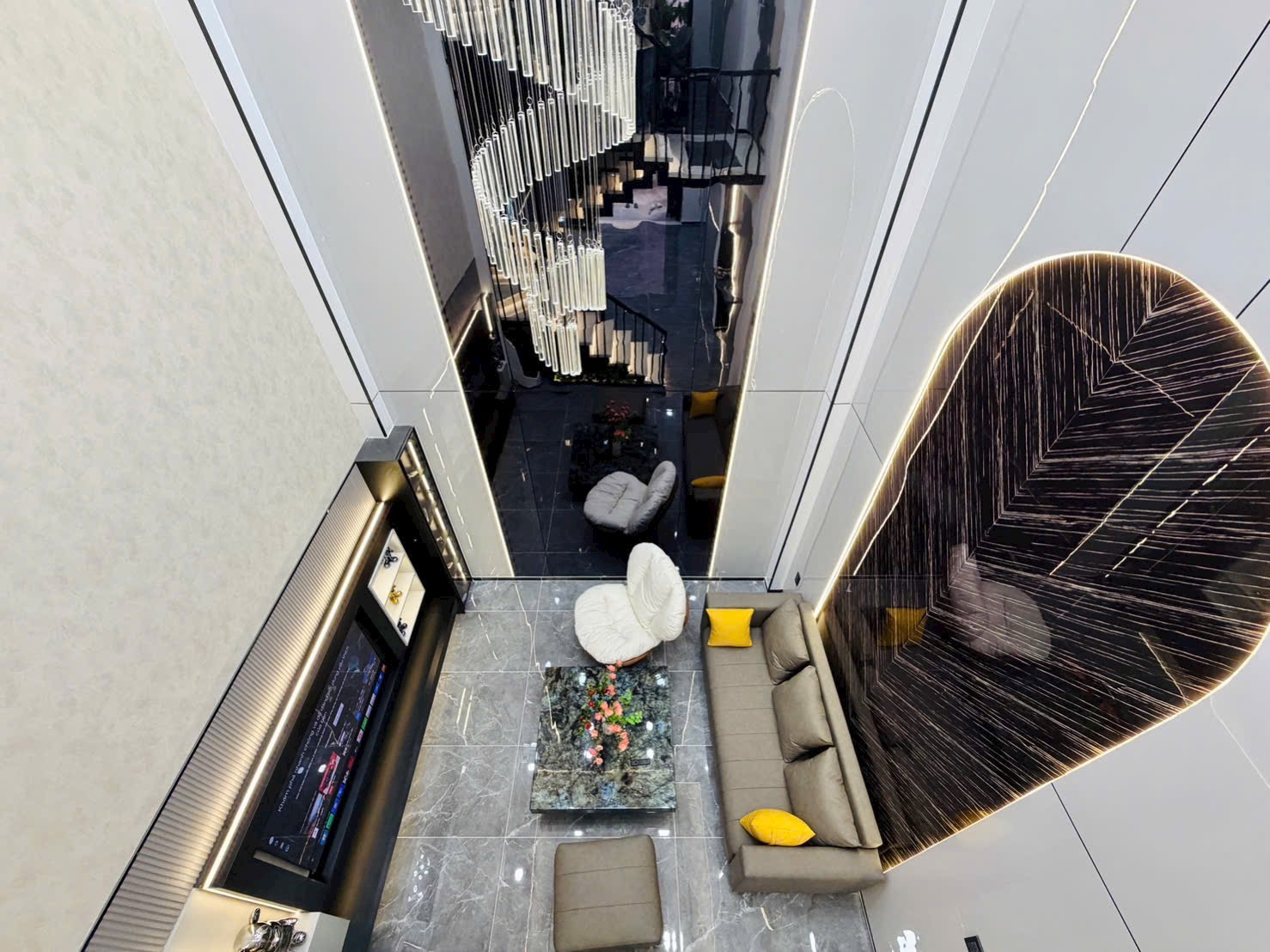 - Phòng khách: Trần cao, hệ thống đèn LED âm trần, phối hợp đèn chùm pha lê, không gian sang như khách sạn 5 sao.