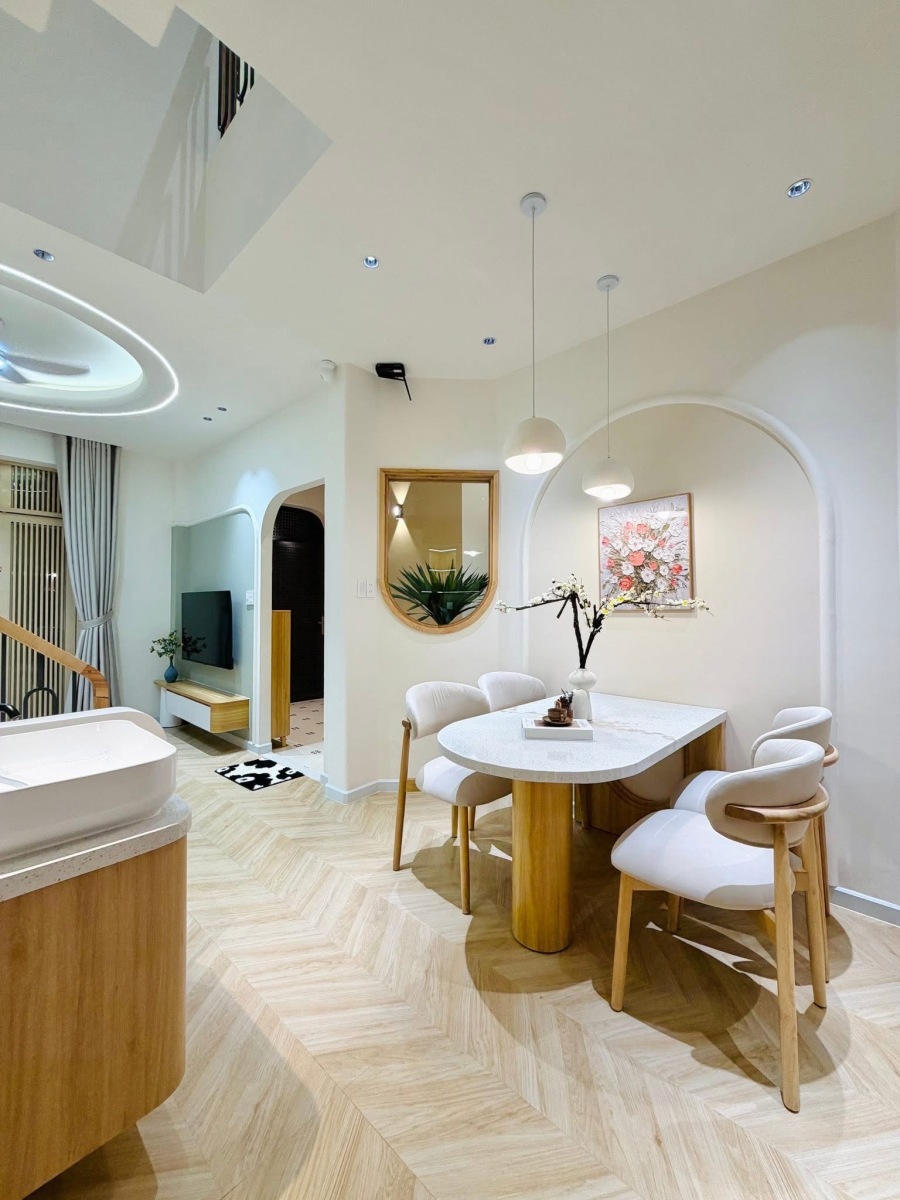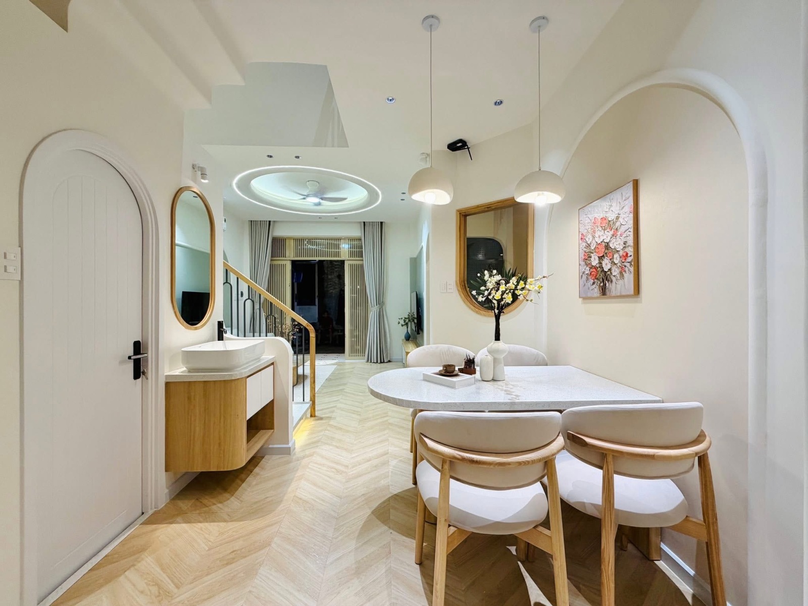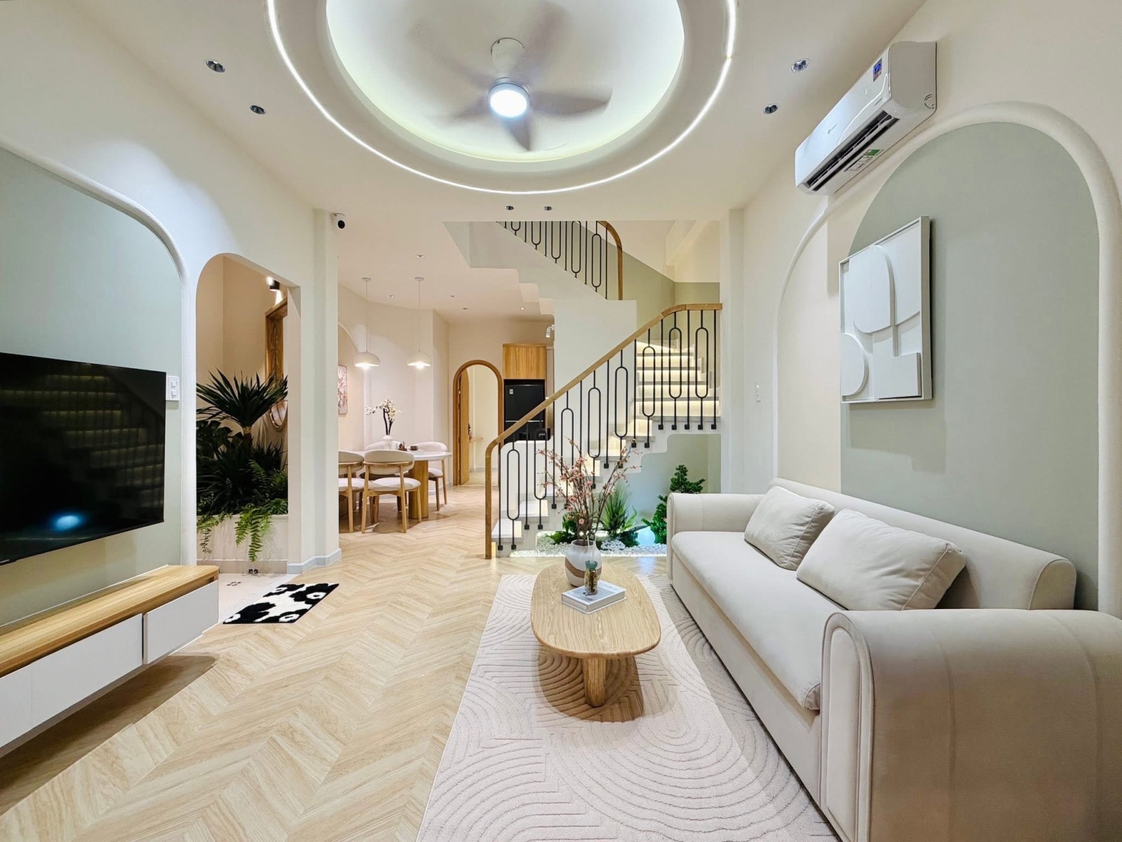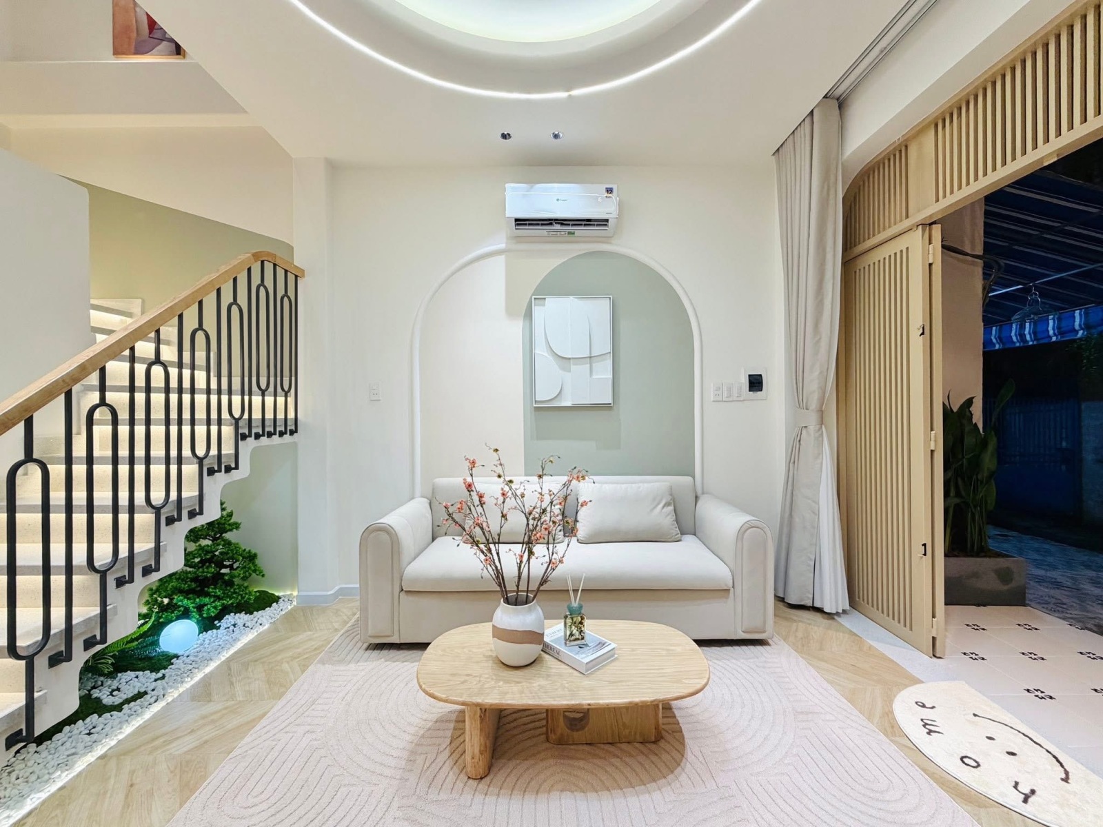 Ngôi nhà được thiết kế theo phong cách minimalist hiện đại, sử dụng vật liệu cao cấp, ánh sáng tự nhiên và bố trí hợp lý. Đặc biệt, ban công rộng và sân trước nhà thoáng đãng là điểm cộng lớn giúp không gian luôn mát mẻ, dễ chịu.