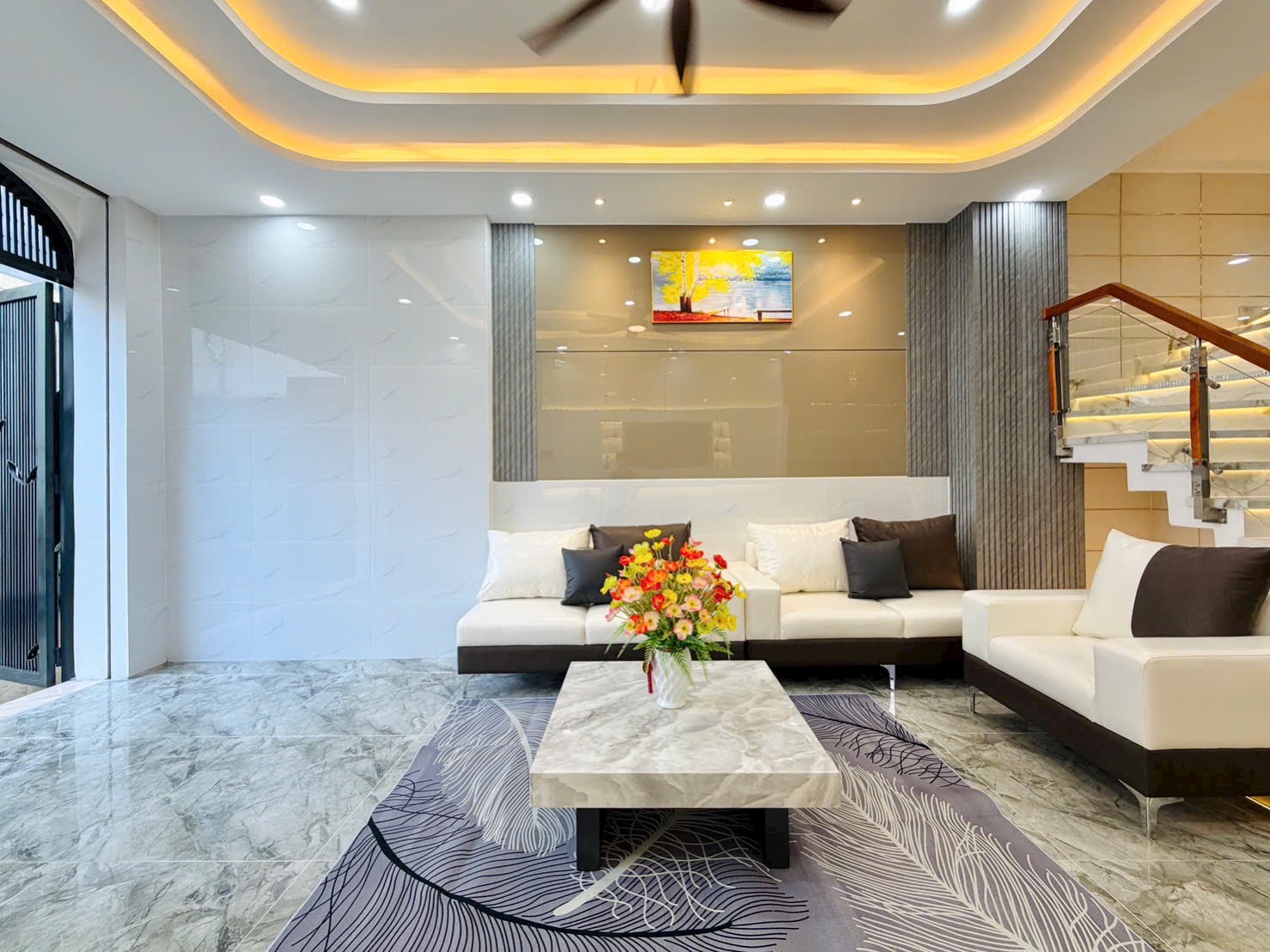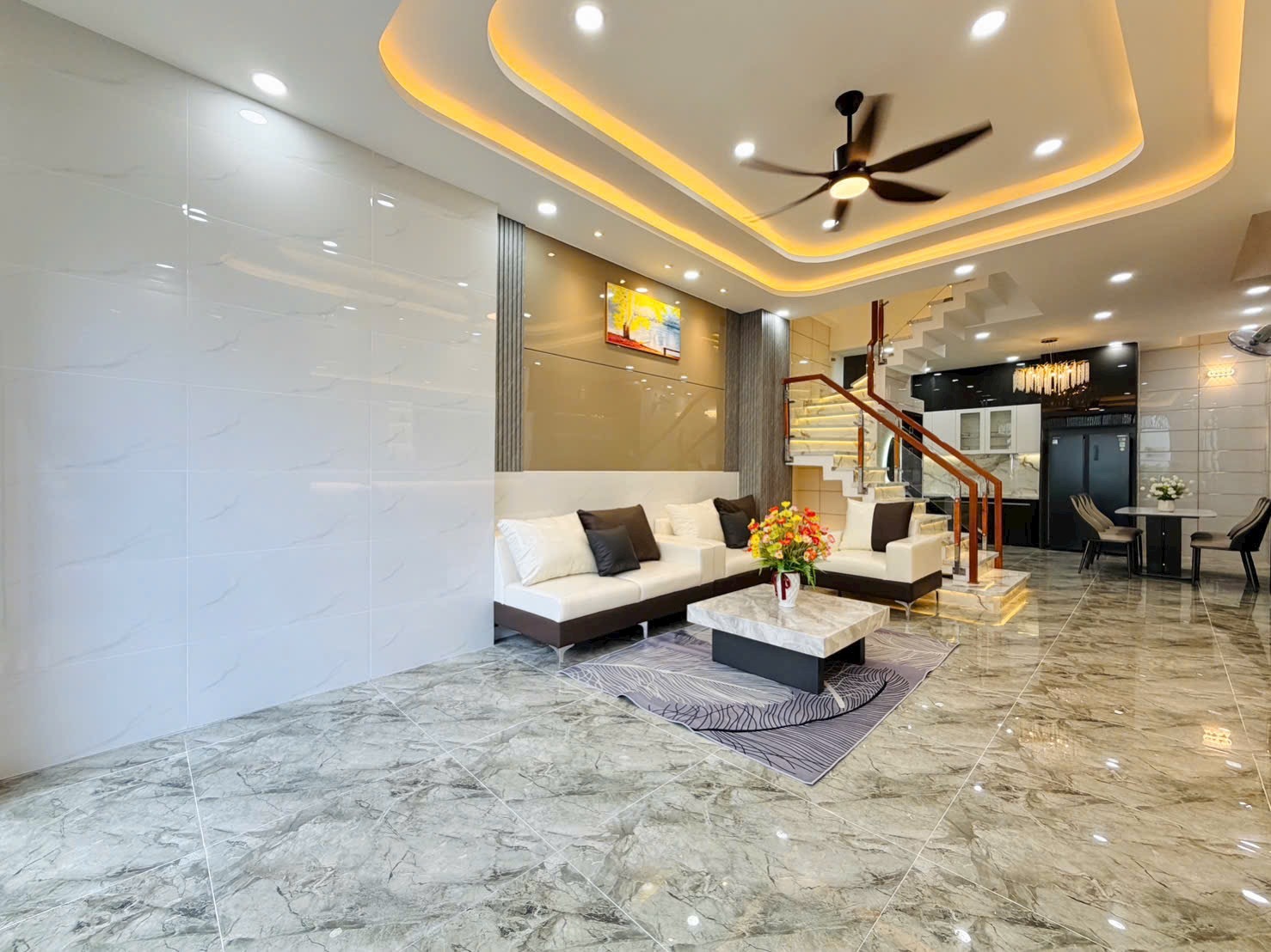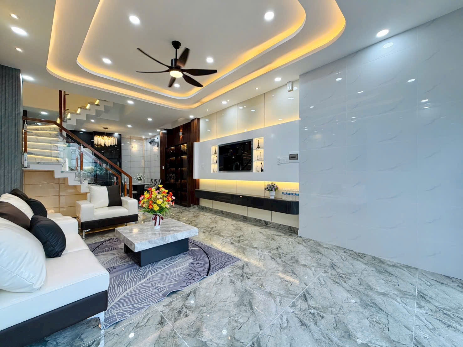 • Nội Thất Cao Cấp: Sofa da trắng – xám nhập khẩu (Hình 1), bàn trà mặt đá vân mây nghệ thuật. Hệ thống ánh sáng trần giật cấp kết hợp đèn led hắt và đèn chùm pha lê (Hình 7, 10) lung linh, mang lại không gian ấm cúng, xa hoa.