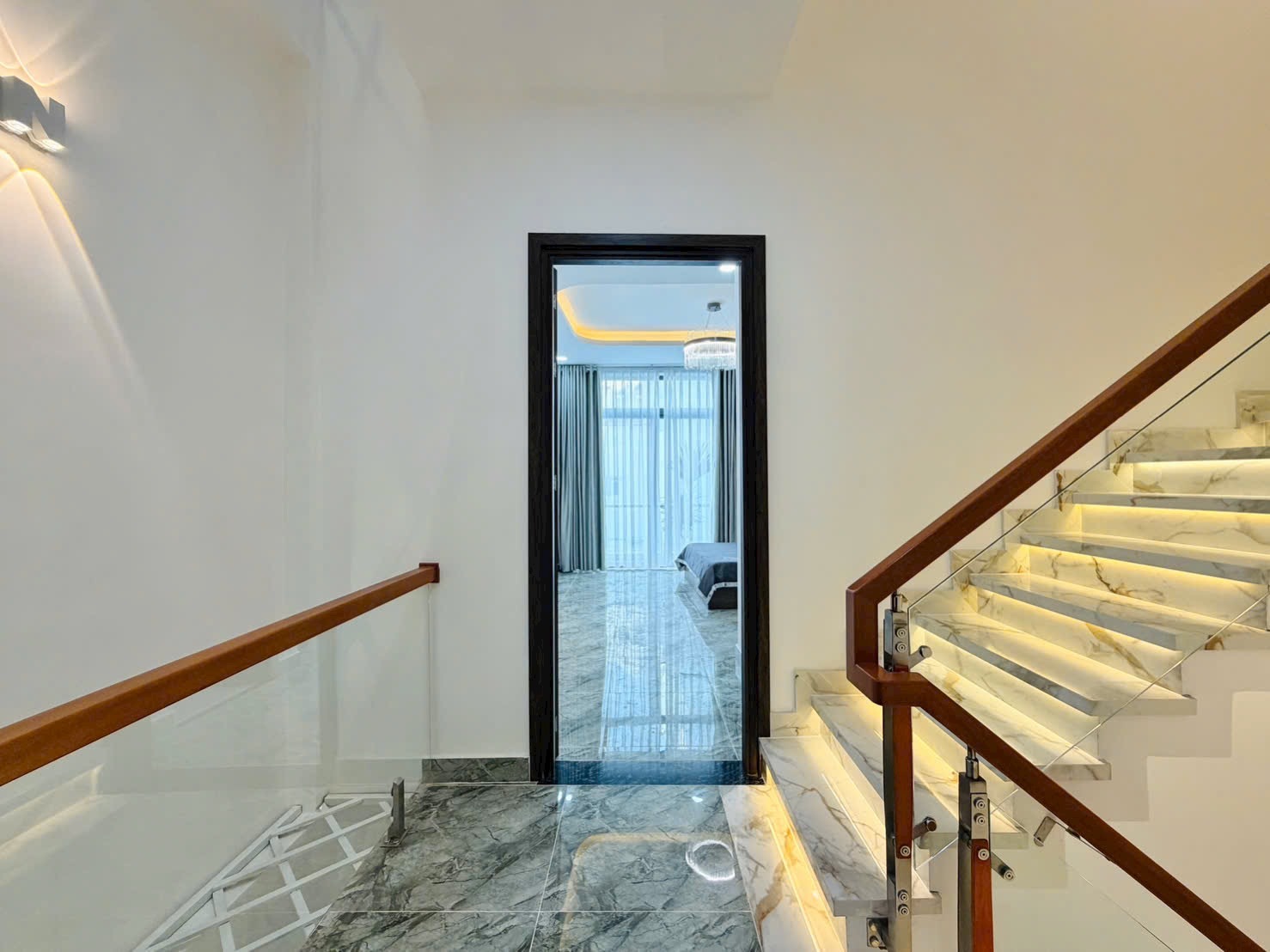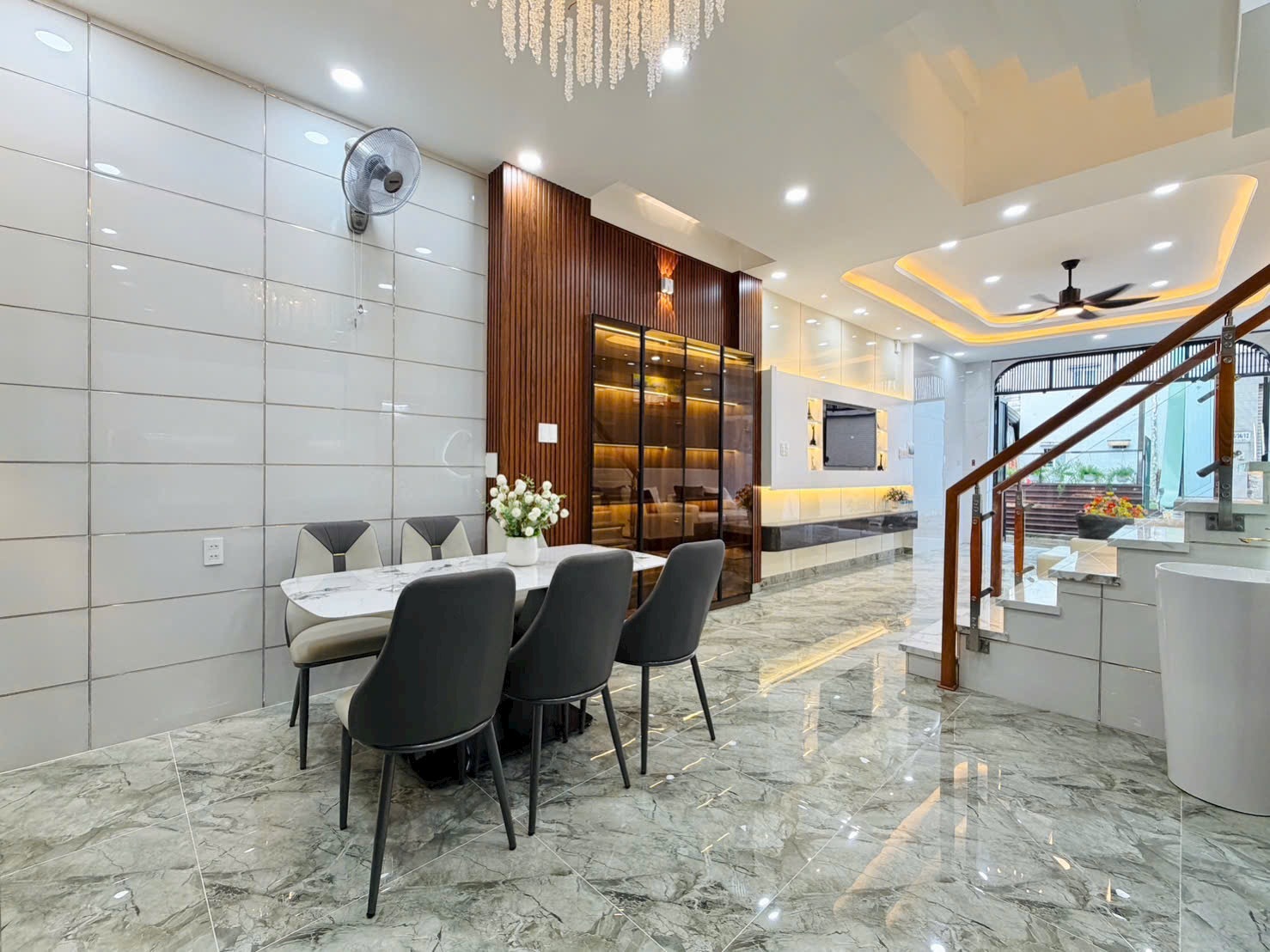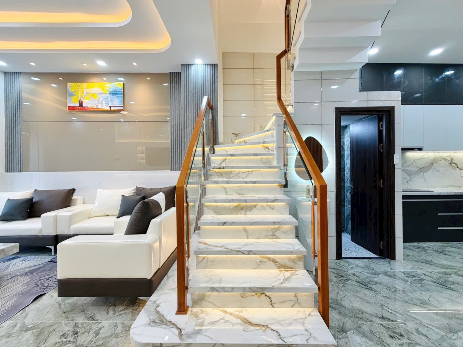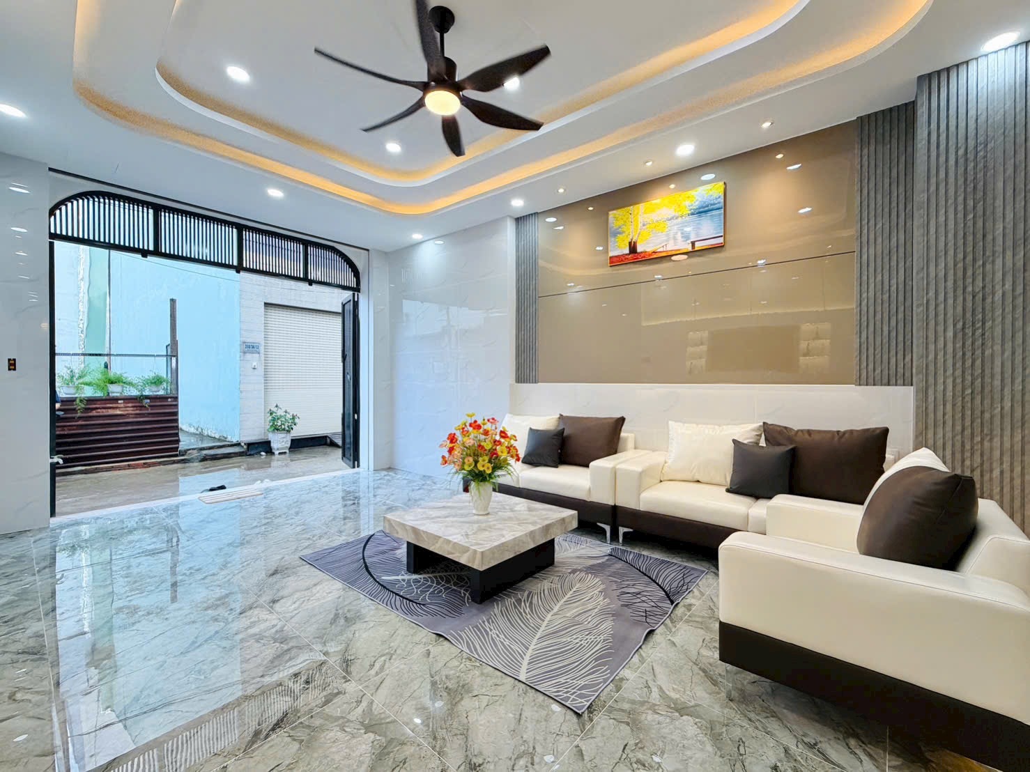 • Nội Thất Cao Cấp: Sofa da trắng – xám nhập khẩu (Hình 1), bàn trà mặt đá vân mây nghệ thuật. Hệ thống ánh sáng trần giật cấp kết hợp đèn led hắt và đèn chùm pha lê (Hình 7, 10) lung linh, mang lại không gian ấm cúng, xa hoa.