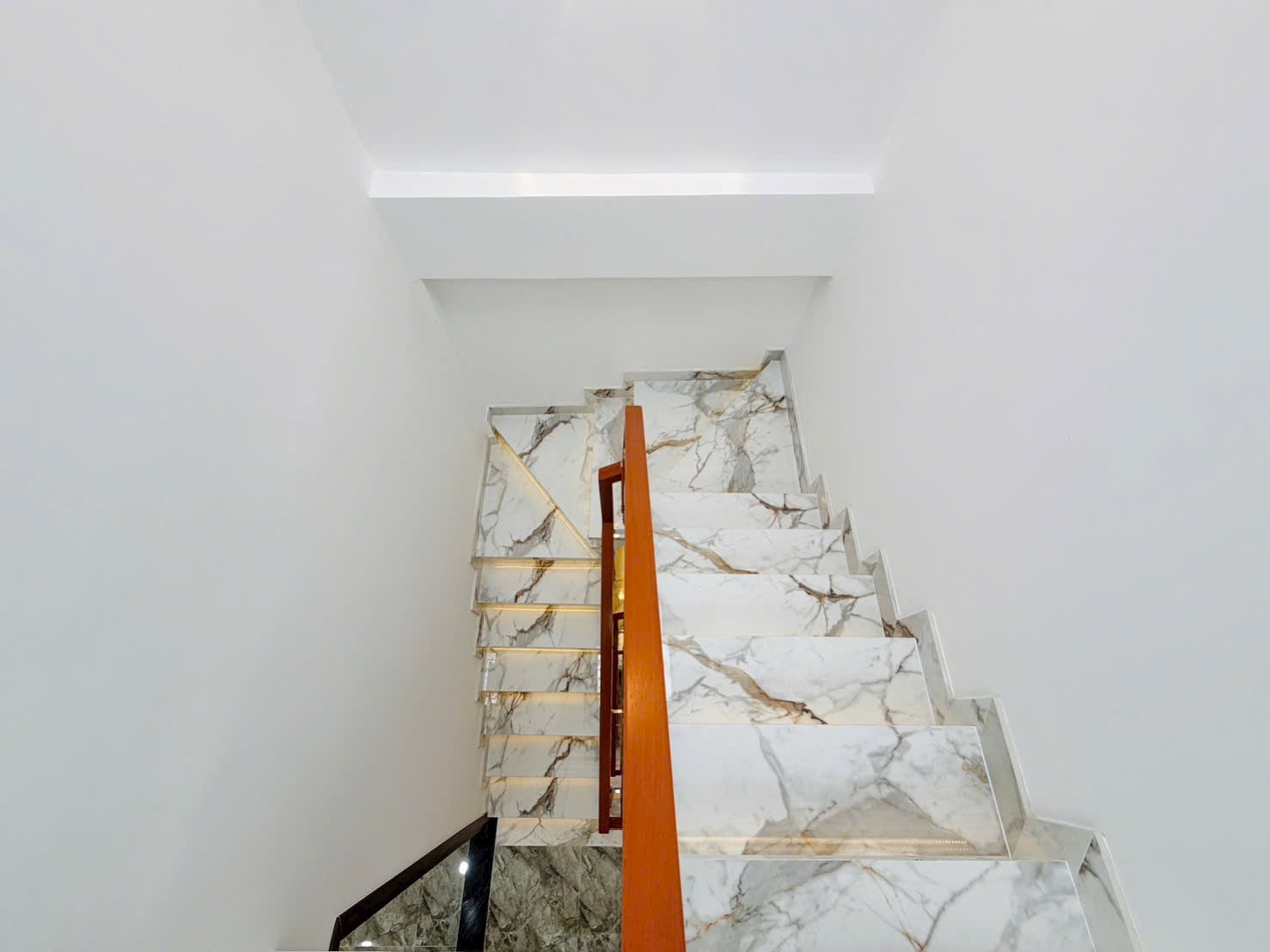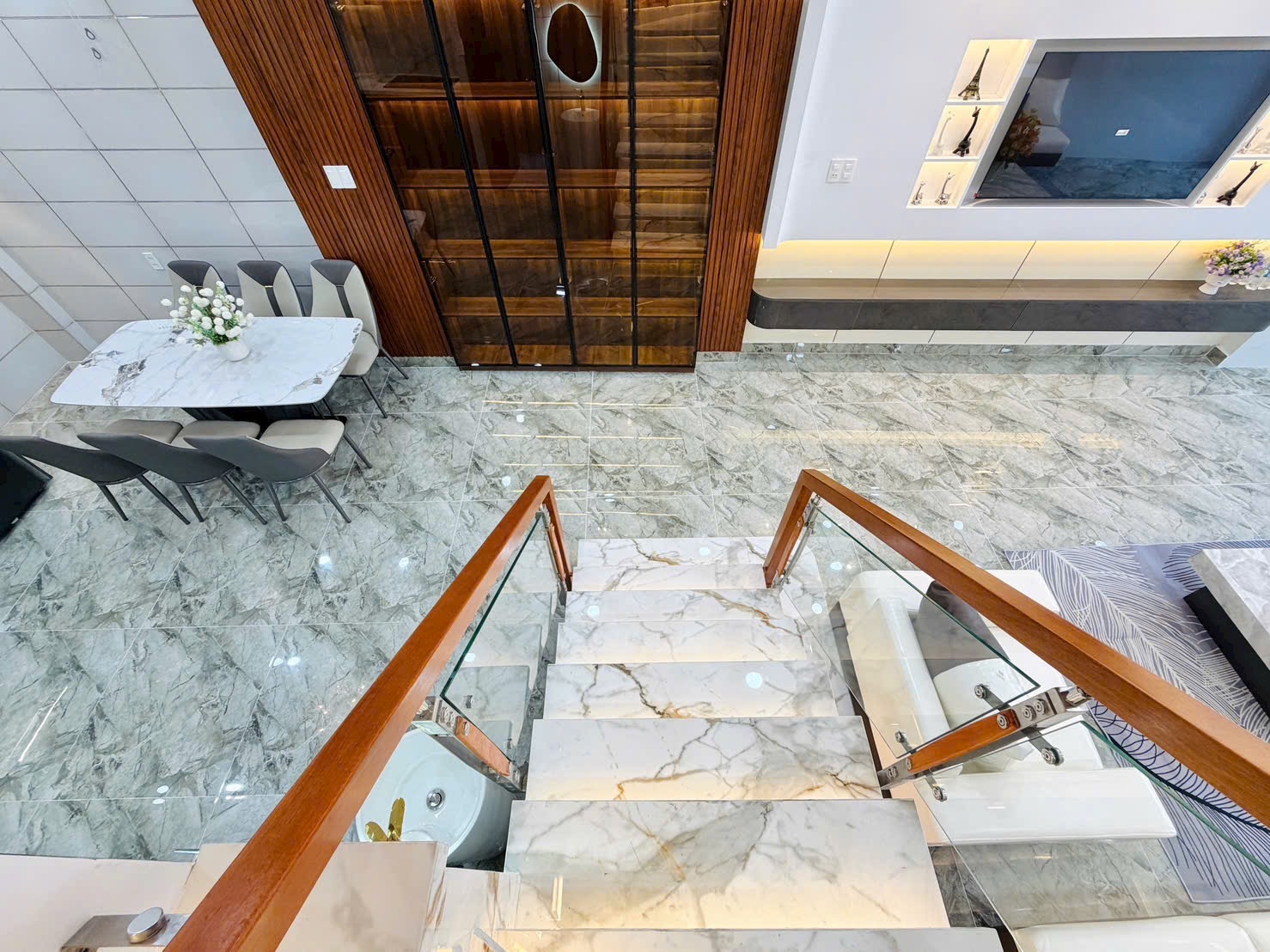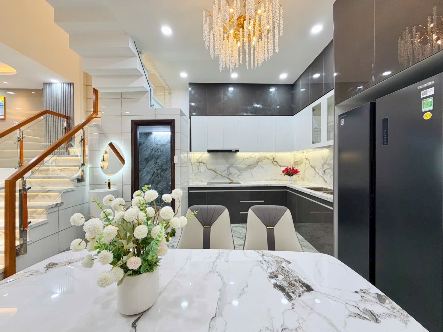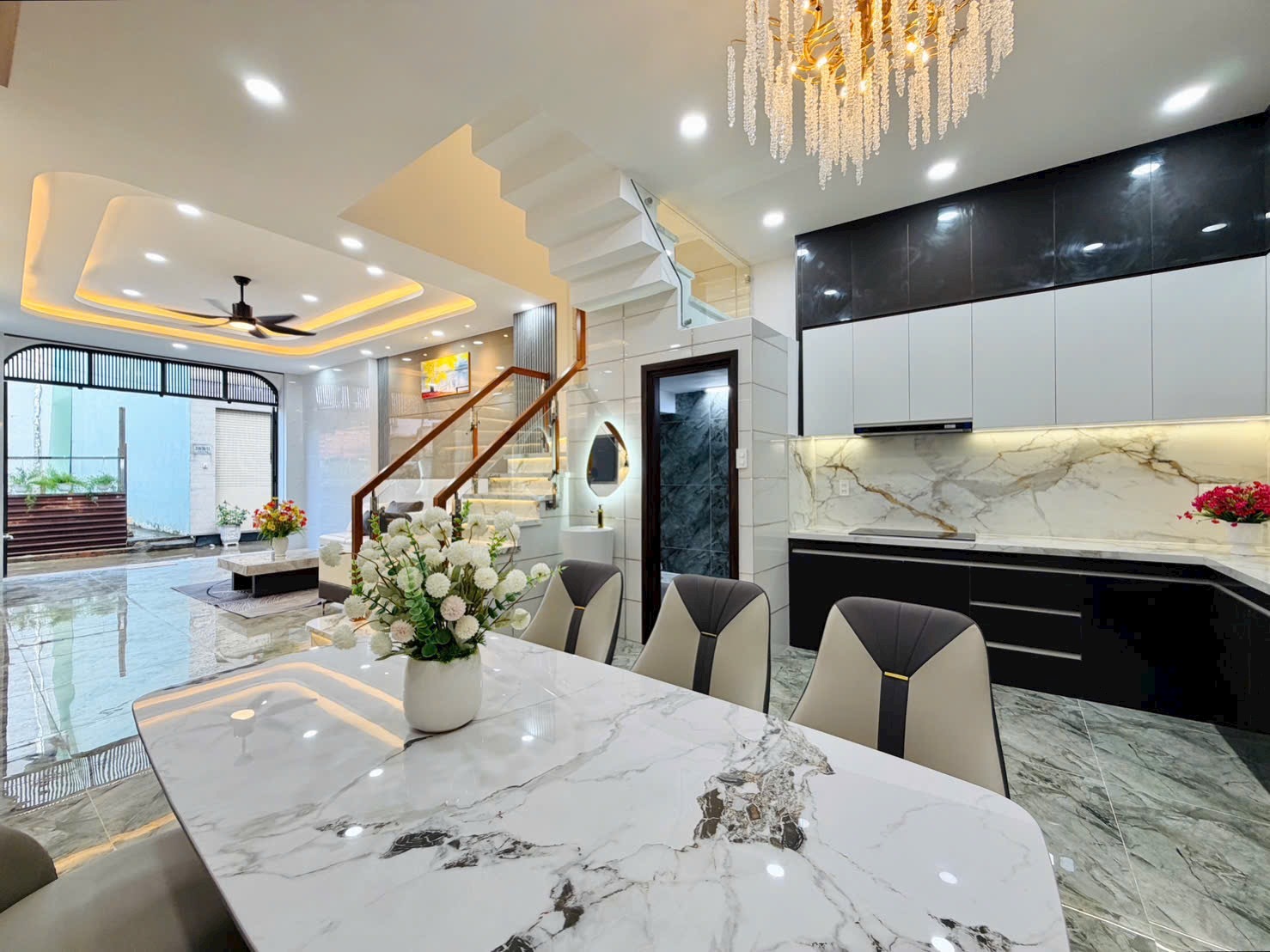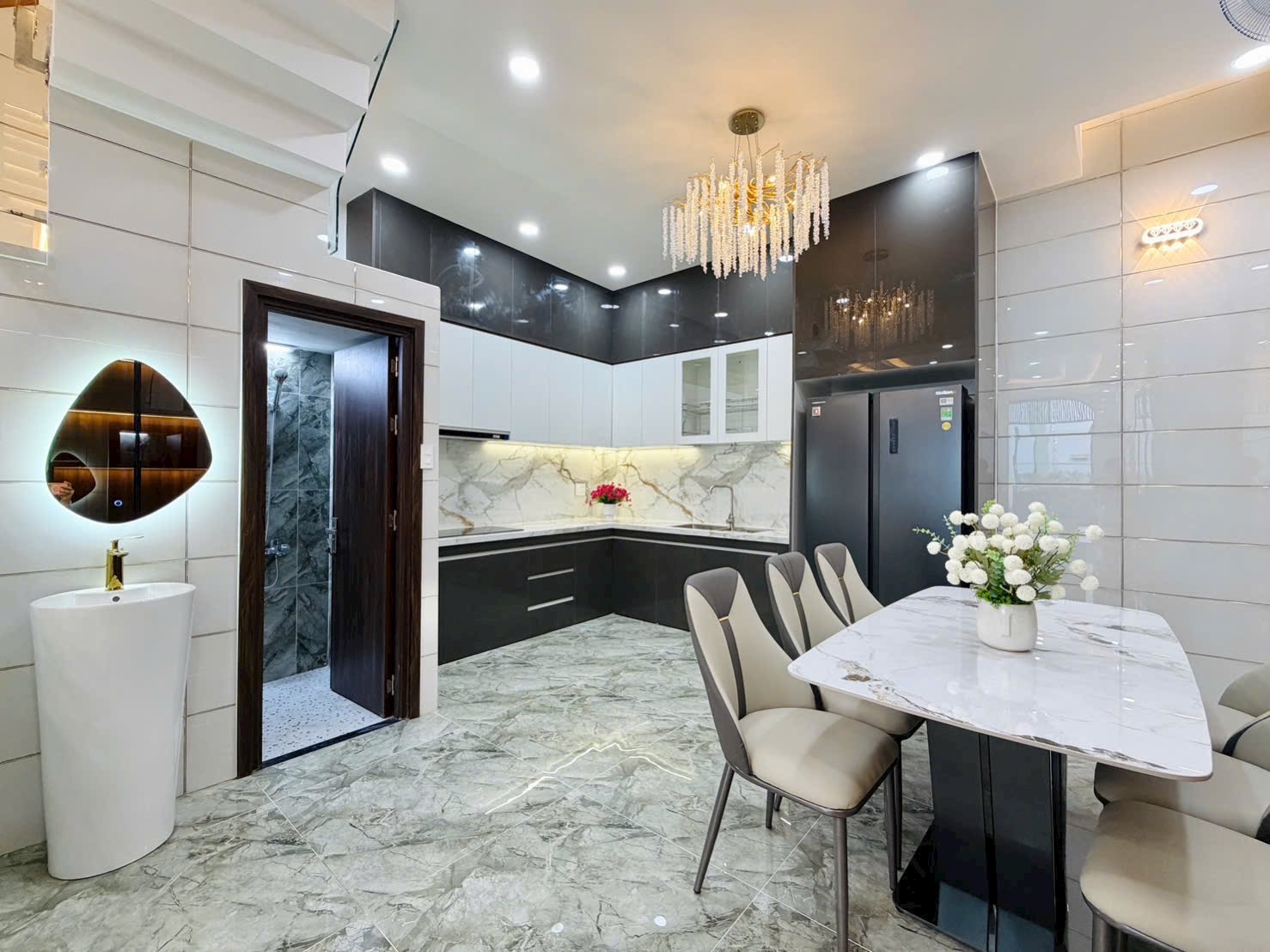 • Khu Bếp: Tủ bếp Acrylic bóng gương tông đen – trắng hiện đại, mặt bếp và bàn ăn đều ốp đá tự nhiên/nhân tạo cao cấp. Thiết kế chữ L tối ưu công năng, sẵn sàng cho mọi nhu cầu nấu nướng và tổ chức tiệc tùng.
