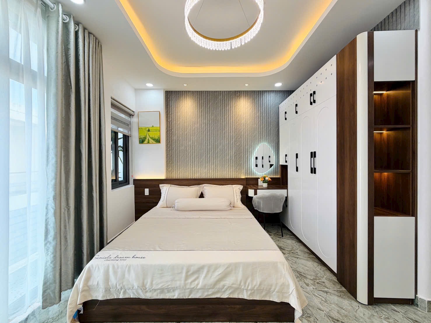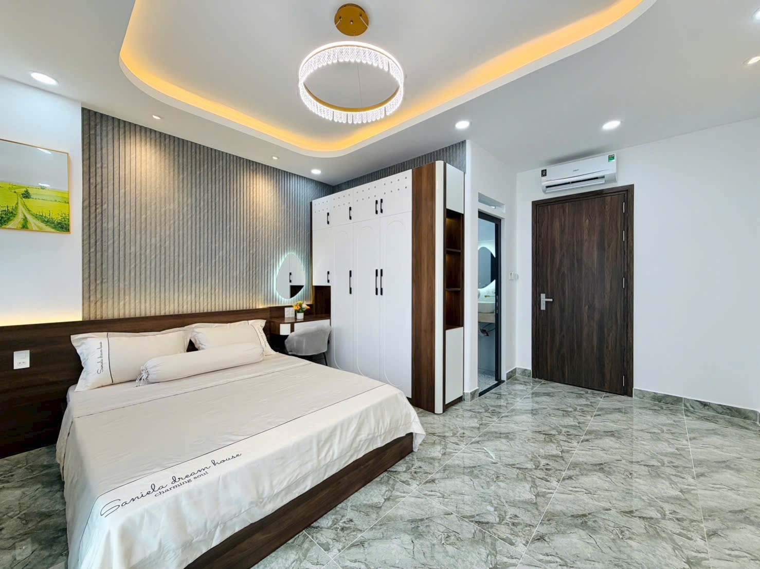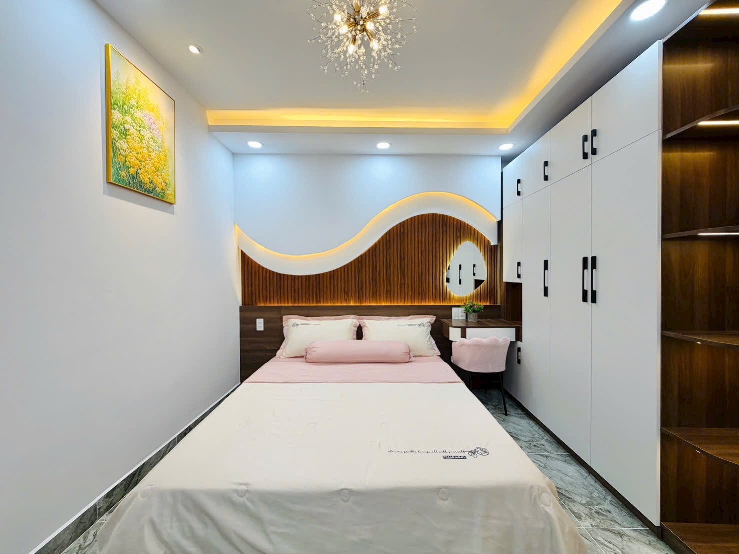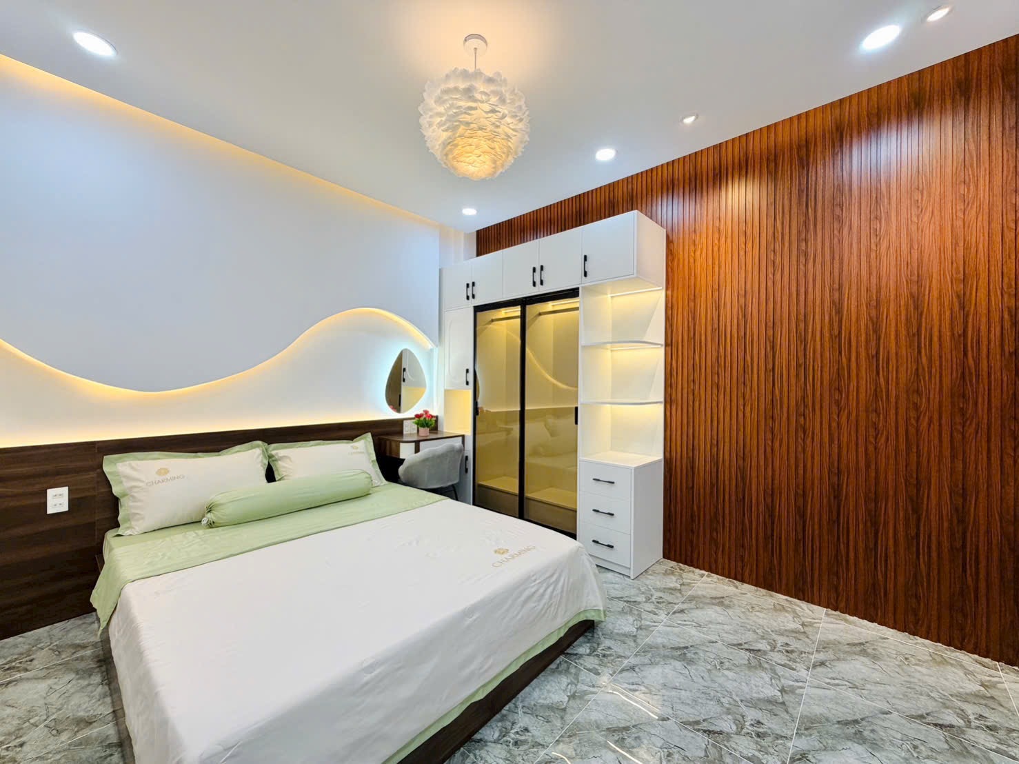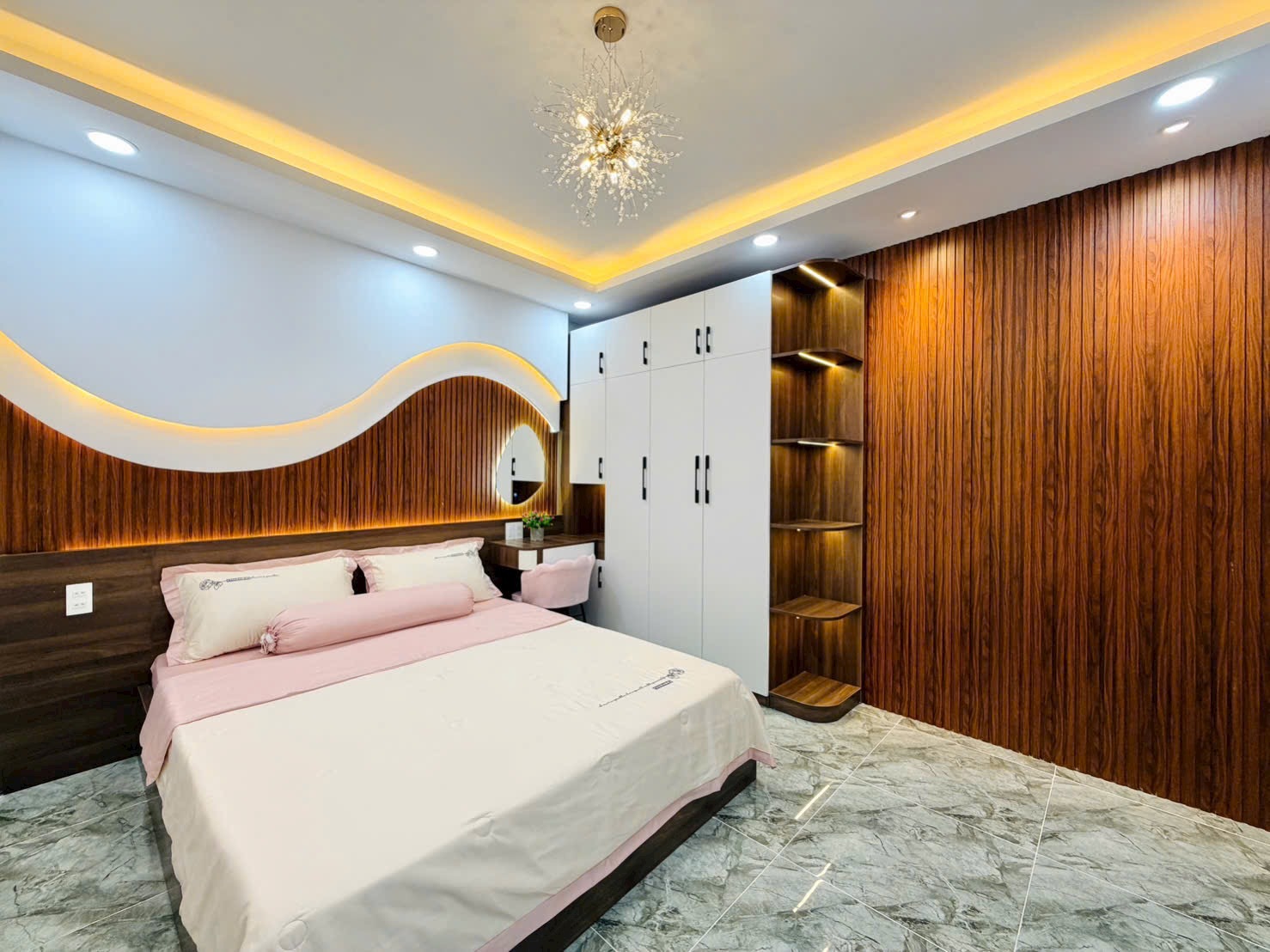 • Điểm Nhấn Kiến Trúc: Tường đầu giường được ốp vật liệu trang trí độc đáo (gỗ nan, gạch sóng, hoặc giấy dán tường cao cấp), kết hợp đèn ngủ hắt và gương trang điểm nghệ thuật, tạo nên sự khác biệt, cá tính cho từng phòng.