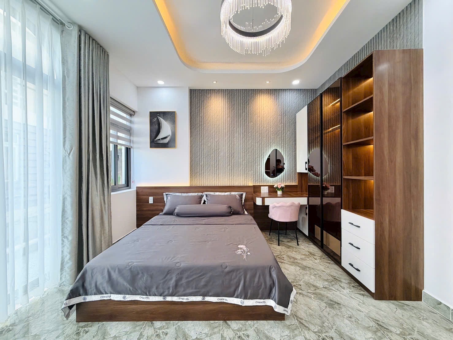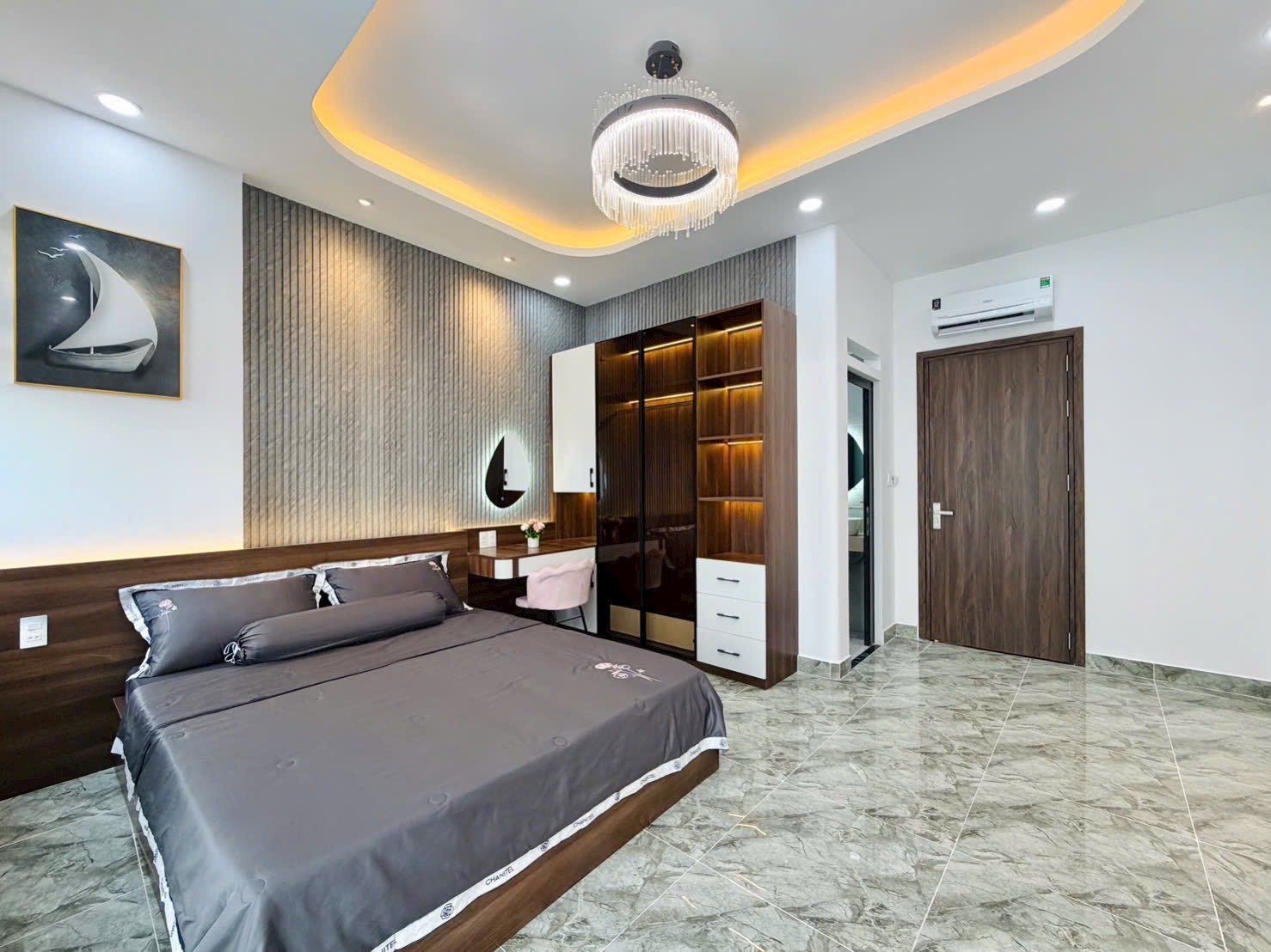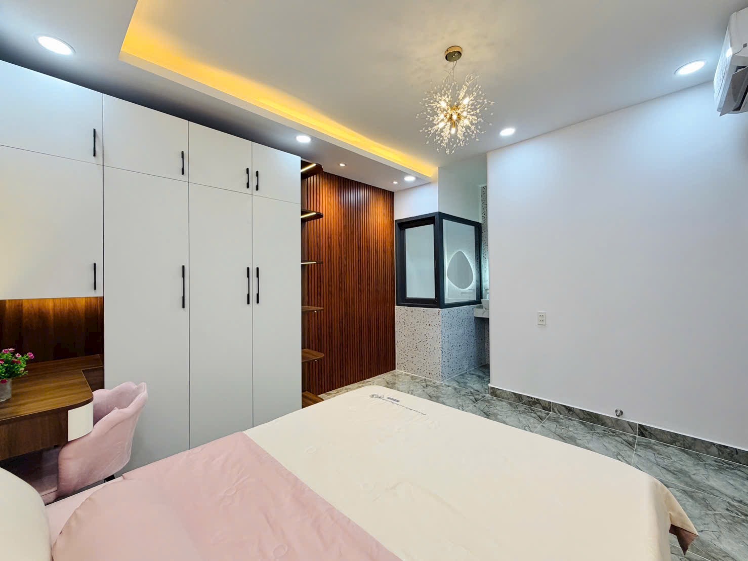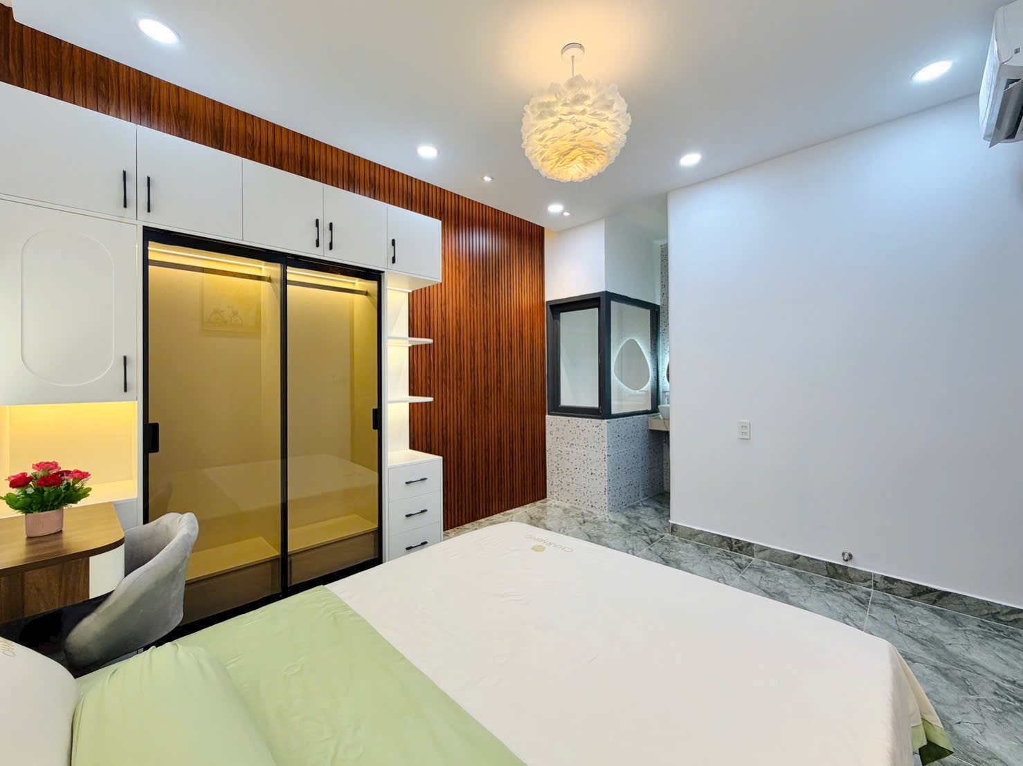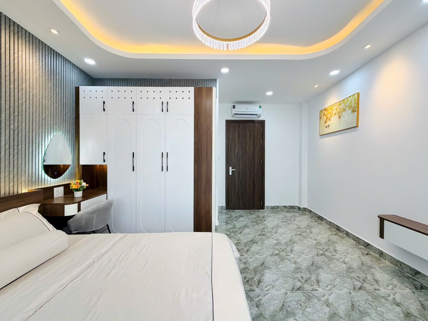 • Điểm Nhấn Kiến Trúc: Tường đầu giường được ốp vật liệu trang trí độc đáo (gỗ nan, gạch sóng, hoặc giấy dán tường cao cấp), kết hợp đèn ngủ hắt và gương trang điểm nghệ thuật, tạo nên sự khác biệt, cá tính cho từng phòng.