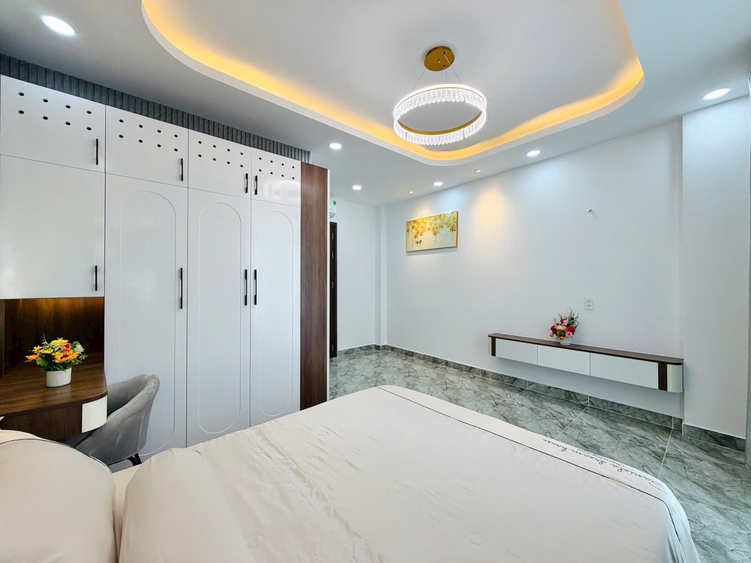 • Phong Cách Hiện Đại: Giường ngủ gỗ cao cấp, ga gối đệm êm ái, tủ quần áo âm tường lớn với thiết kế thông minh (Hình 4, 9).
