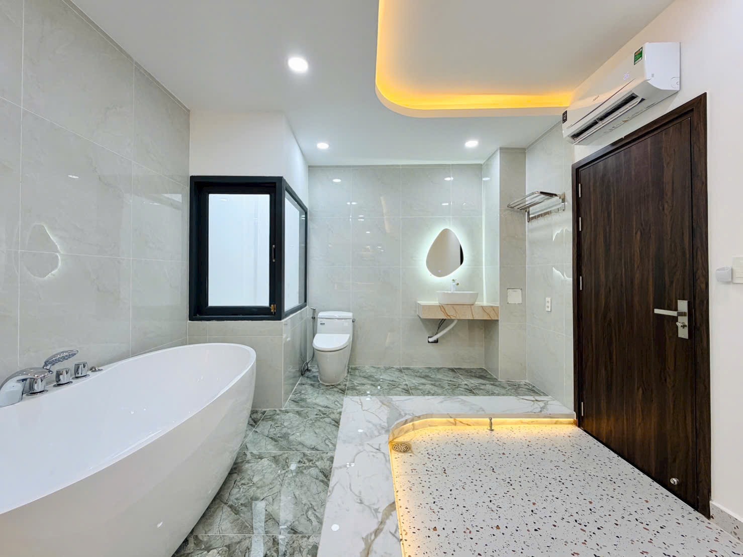 • Phòng Tắm Master: Bồn tắm nằm độc lập, lavabo đặt bàn/tủ, cùng vách kính tắm đứng (Hình 6, 8). Đặc biệt, hệ thống vòi sen và phụ kiện được mạ vàng/đen (Hình 8) tạo nên vẻ đẹp quý phái.
