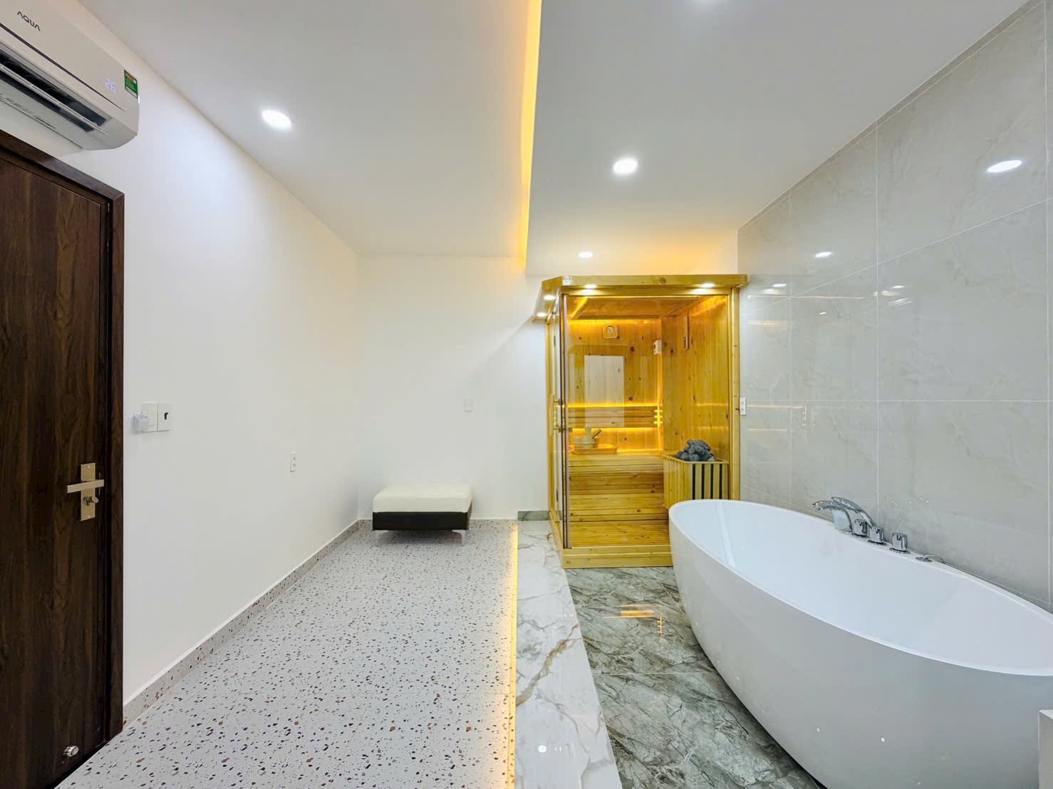 • Phòng Xông Hơi (Sauna): Một phòng sauna bằng gỗ thông sang trọng (Hình 6), giúp gia chủ thư giãn, giải độc cơ thể, nâng cao sức khỏe ngay tại nhà sau một ngày làm việc căng thẳng. Đây là điểm nhấn biến căn nhà trở thành một resort thu nhỏ.