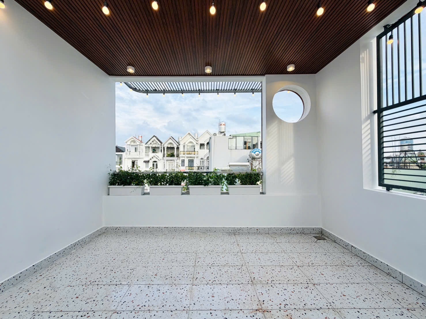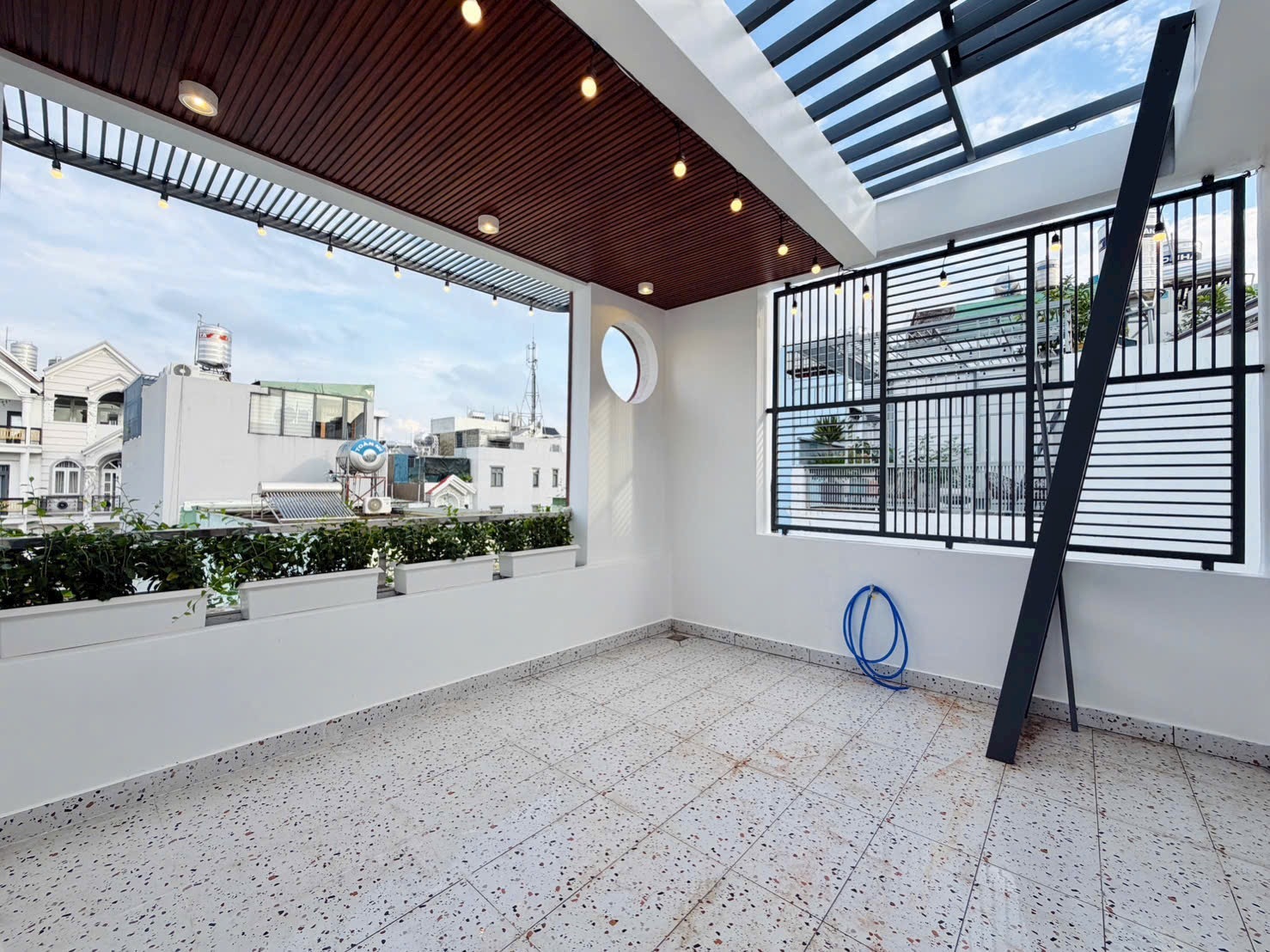 • Sân Thượng: Rộng rãi, có mái che giàn Pergola (Hình 5), rất lý tưởng để biến thành khu vực BBQ ngoài trời, phòng gym, hoặc một vườn cây cảnh mini, nơi cả gia đình có thể cùng nhau tận hưởng không khí trong lành, ngắm nhìn thành phố.