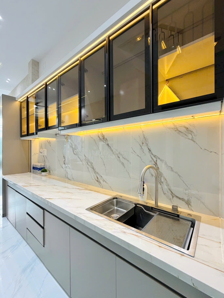 Khu bếp nối liền phòng khách, tủ bếp MDF chống ẩm sơn tĩnh điện, mặt đá hoa cương cao cấp, đèn LED vàng ấm, cửa sổ thông thoáng giúp không gian luôn dễ chịu.