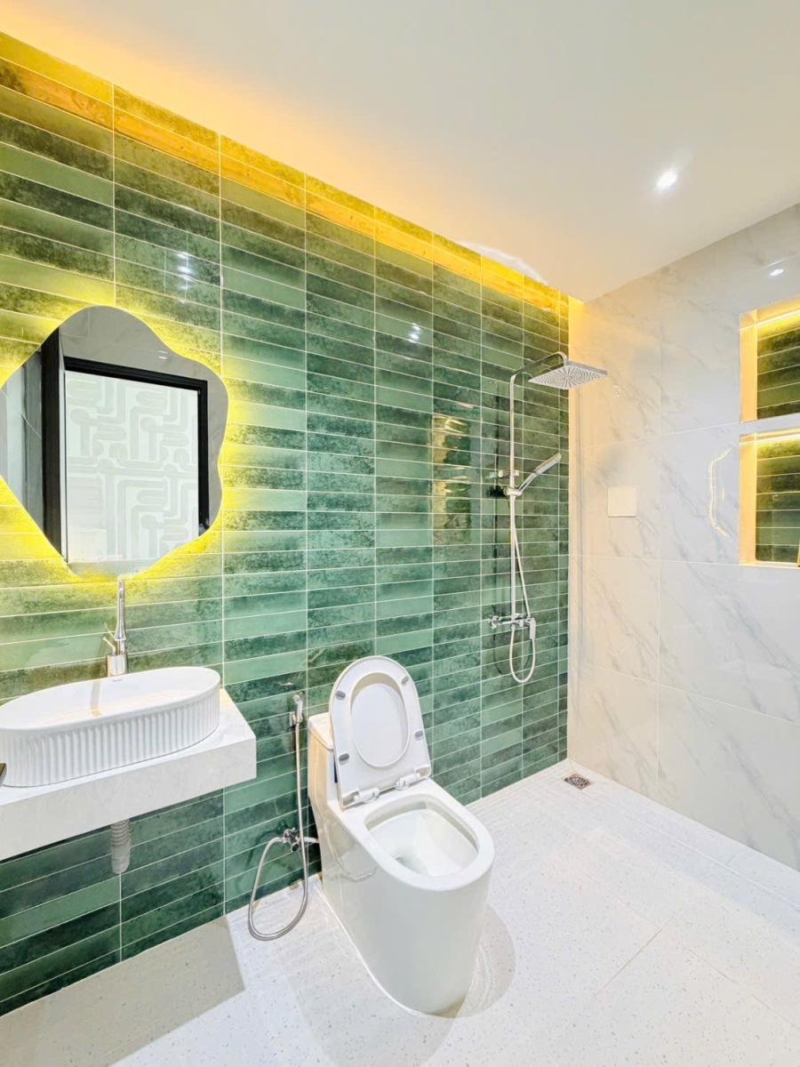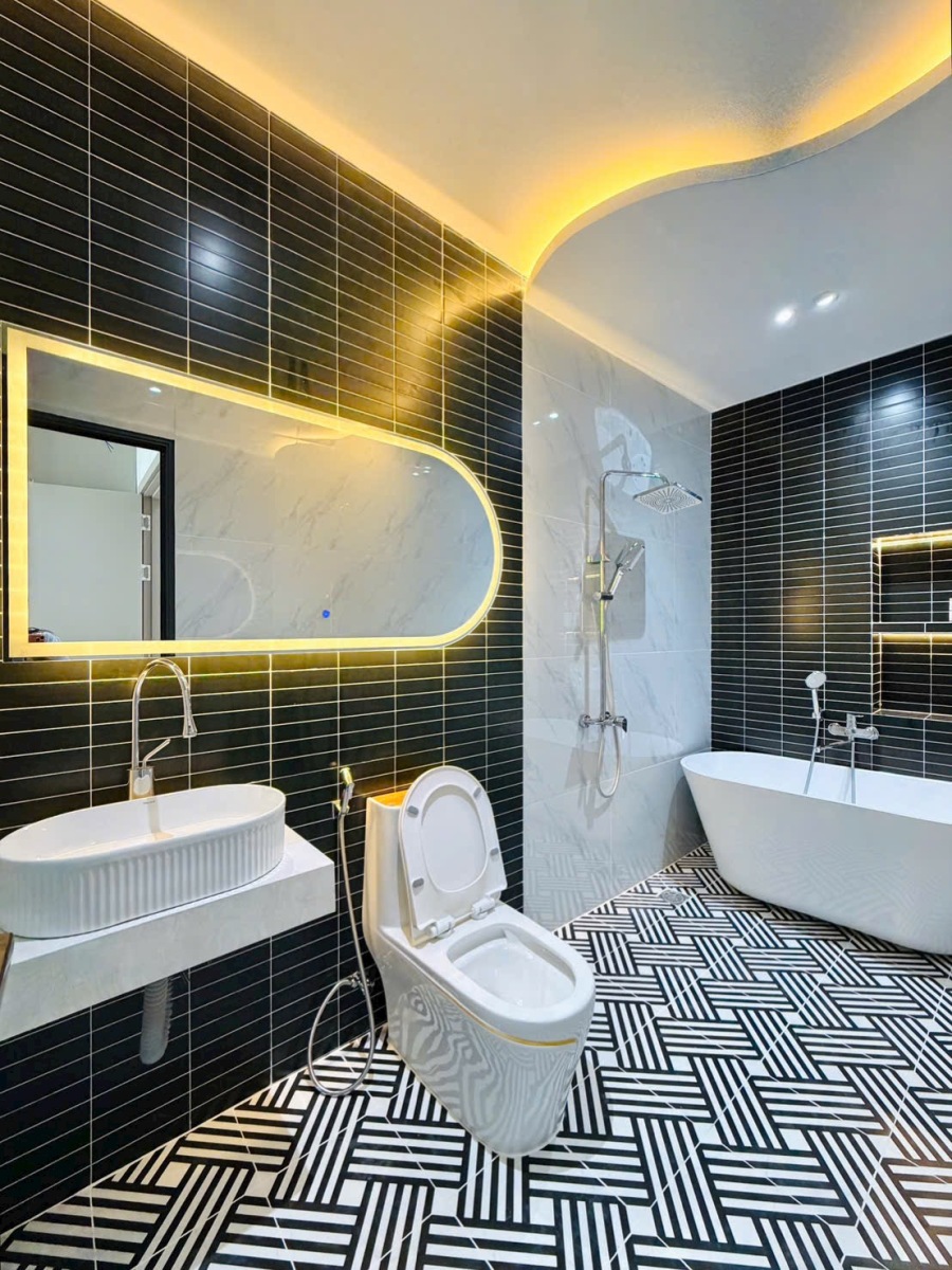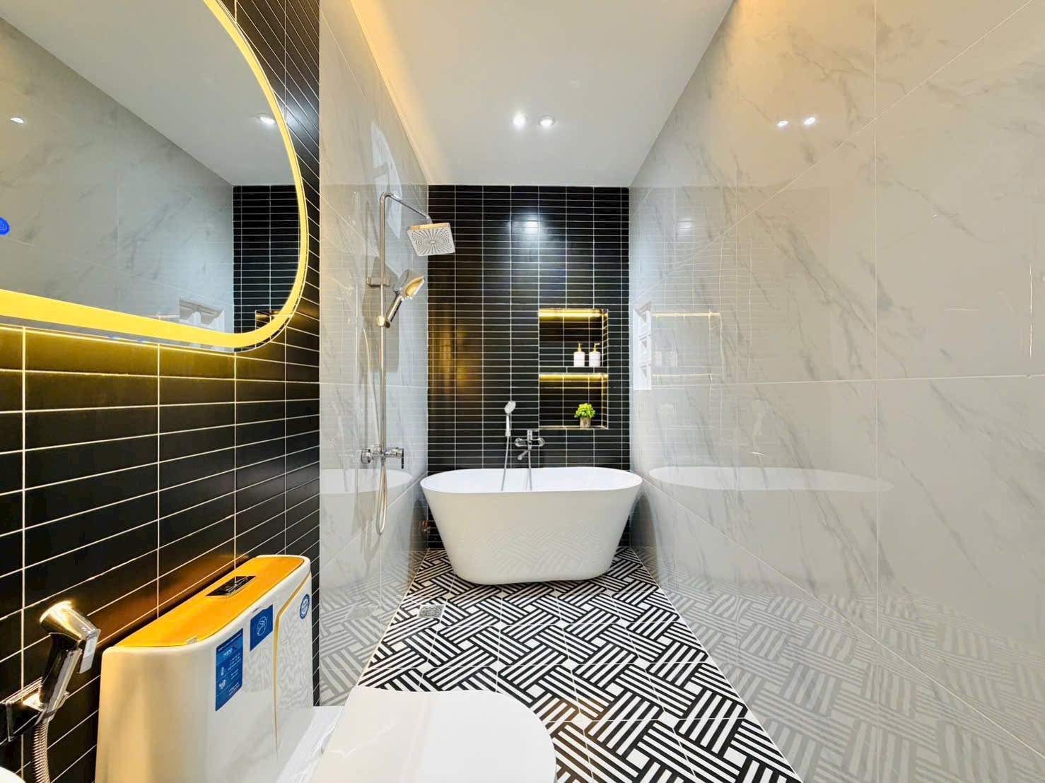 Phòng tắm lát gạch men toàn phần, thiết bị vệ sinh hiện đại, bồn tắm nằm và kính cường lực, mang lại cảm giác thư giãn chuẩn resort tại nhà.