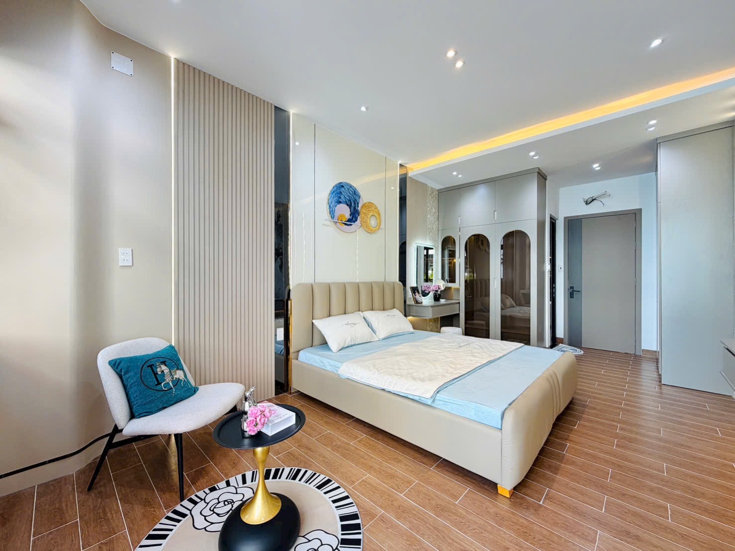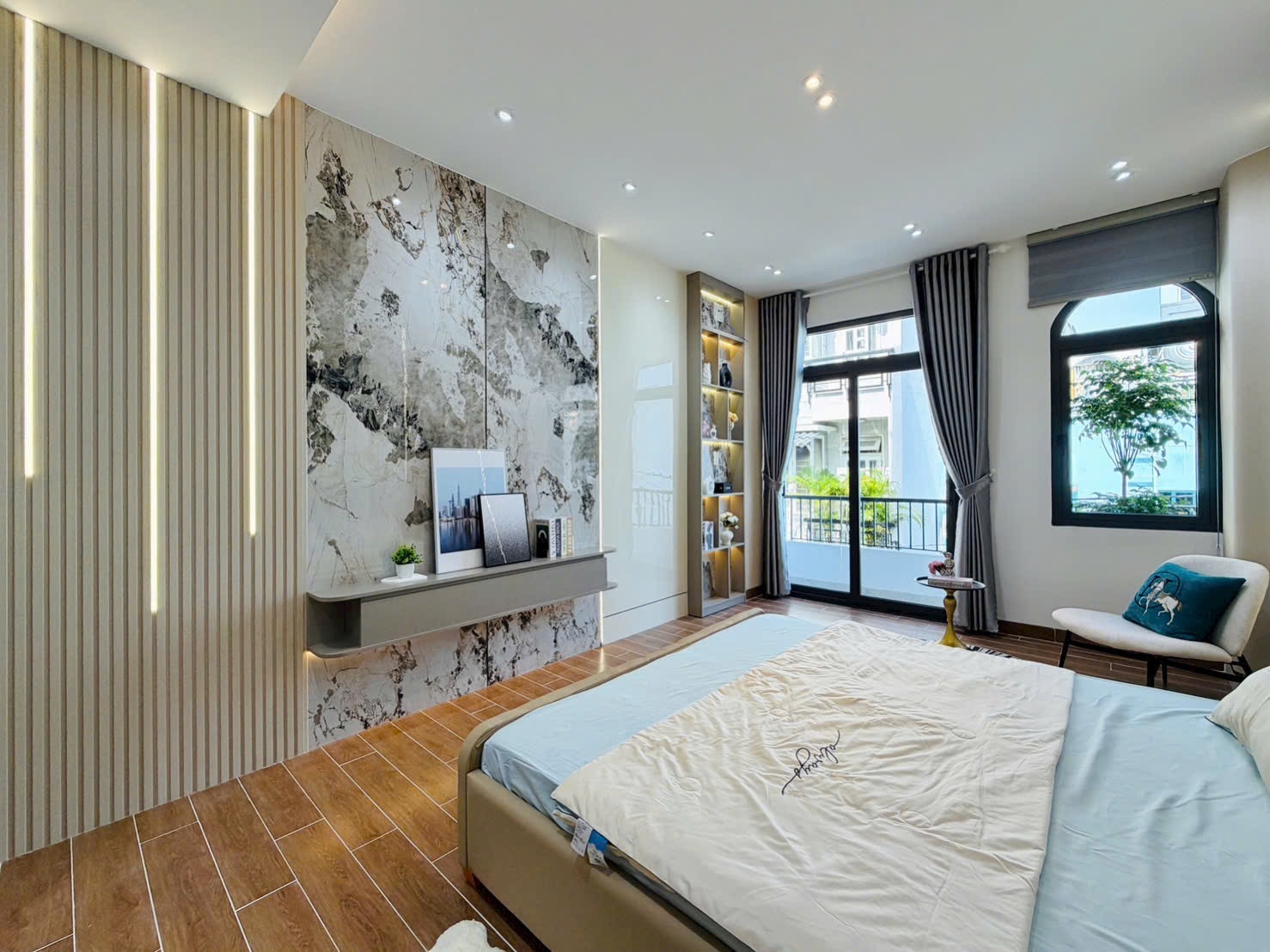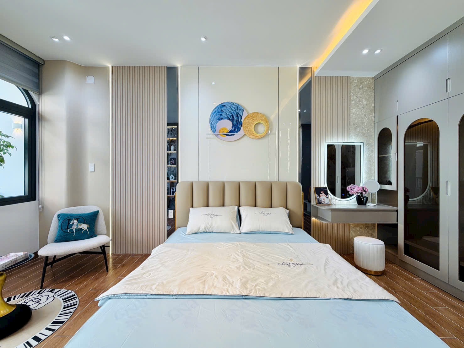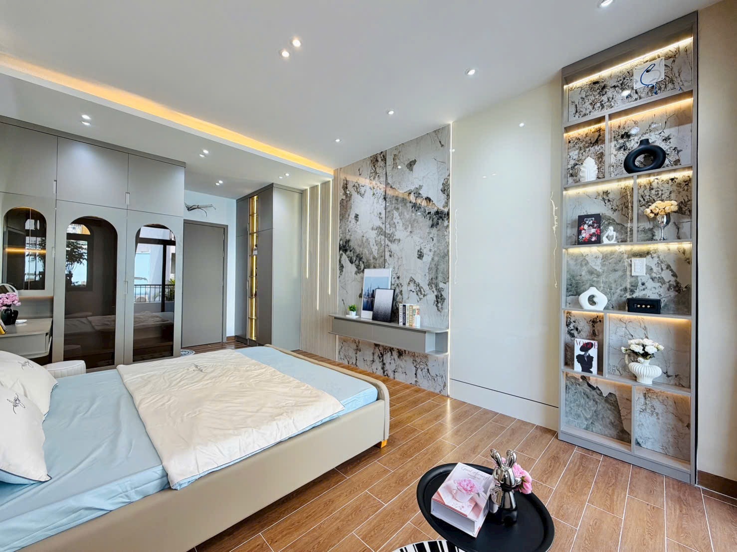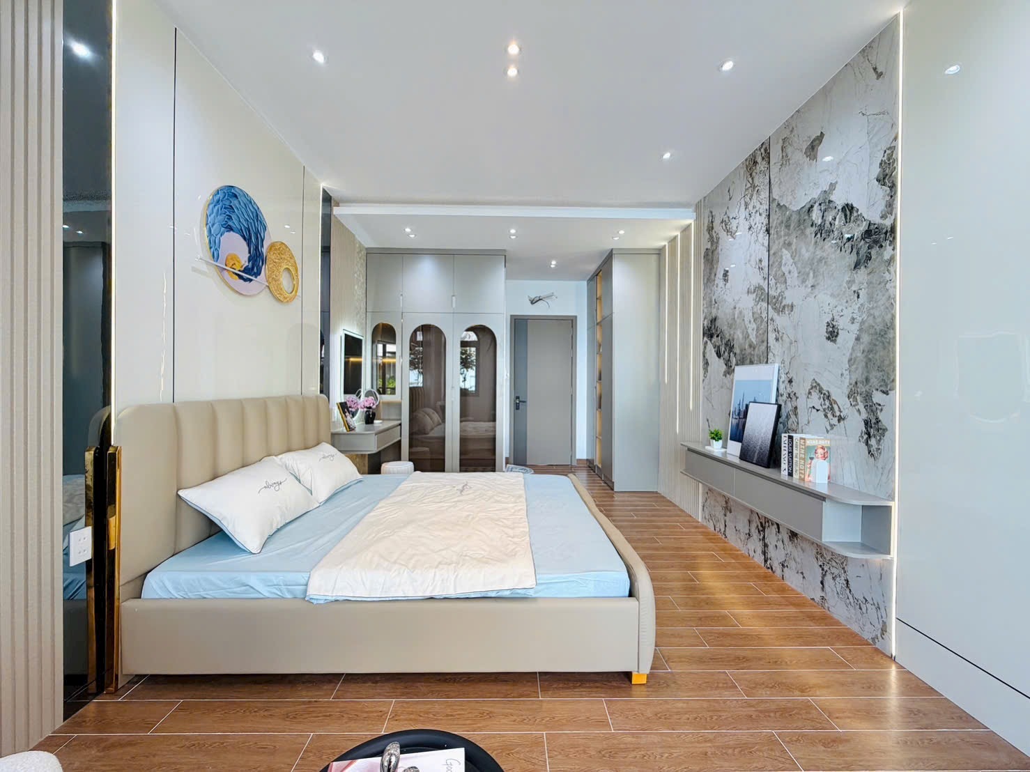 Phòng ngủ được thiết kế chuẩn khách sạn 4–5 sao, mỗi phòng có ban công riêng, tủ âm tường, bàn trang điểm, rèm 2 lớp cao cấp, đèn hắt trần tinh tế.