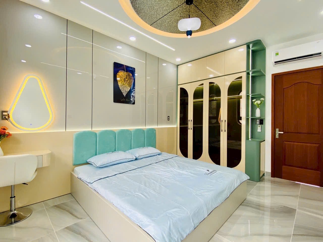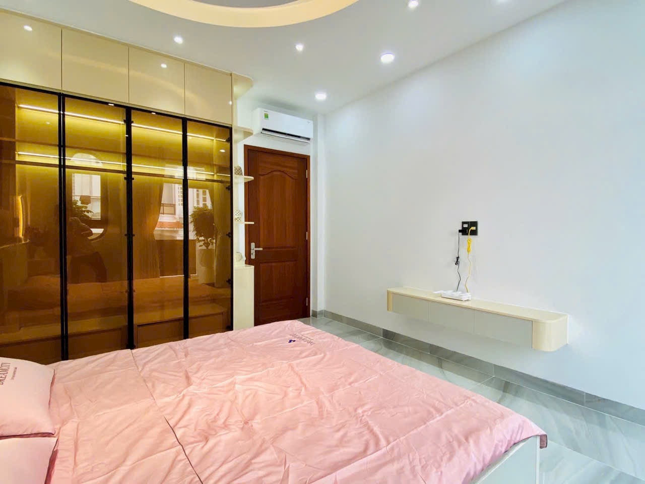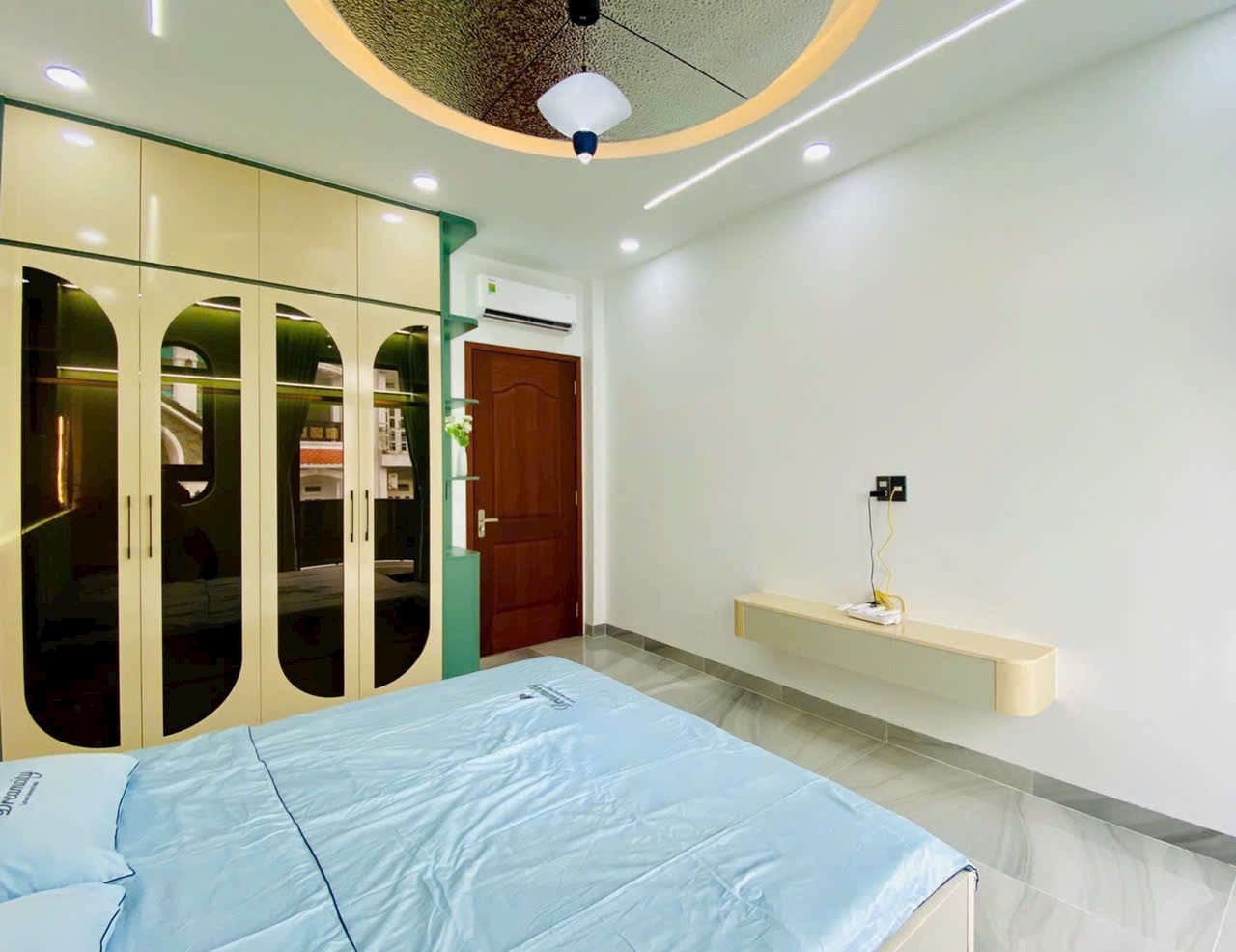 - Phòng ngủ được bố trí hợp lý, có cửa sổ lớn, rèm chống nắng, tủ âm tường, giường gỗ tự nhiên