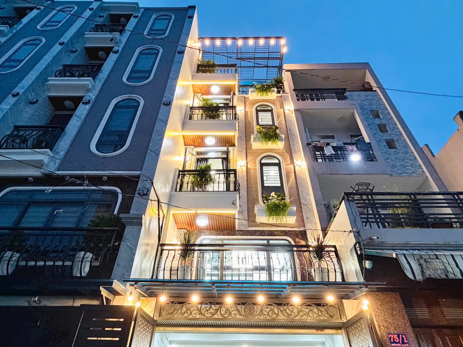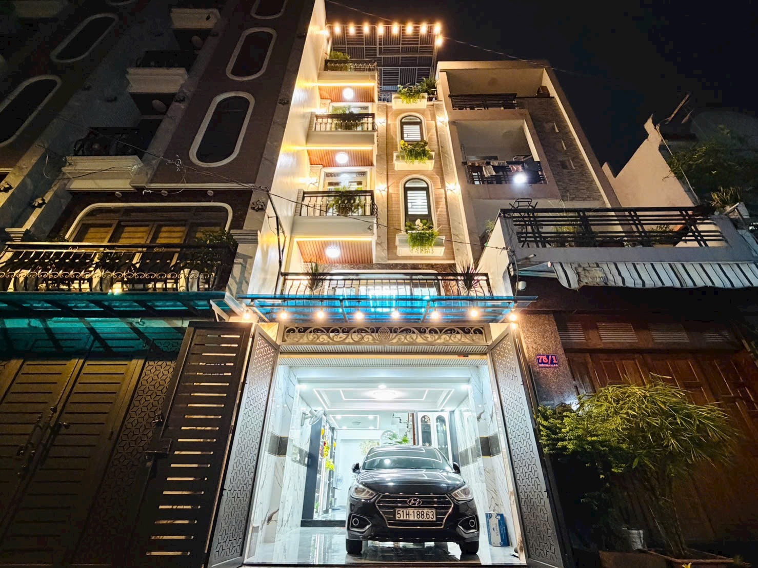 - Mặt tiền nổi bật với hệ thống đèn vàng ấm áp, ban công trồng cây xanh tạo cảm giác tươi mới mỗi khi về nhà.