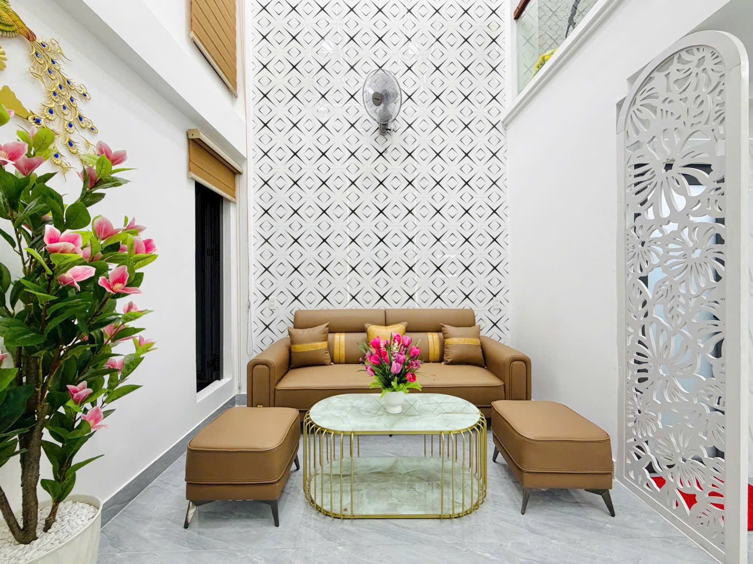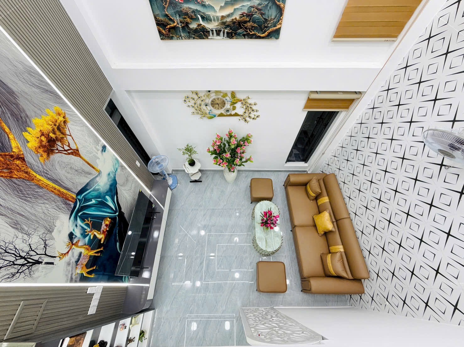 - Phòng khách trần cao, ốp gạch hoa văn 3D hiện đại, kết hợp bộ sofa da cao cấp, bàn trà mặt đá trắng – vàng đồng cực sang.