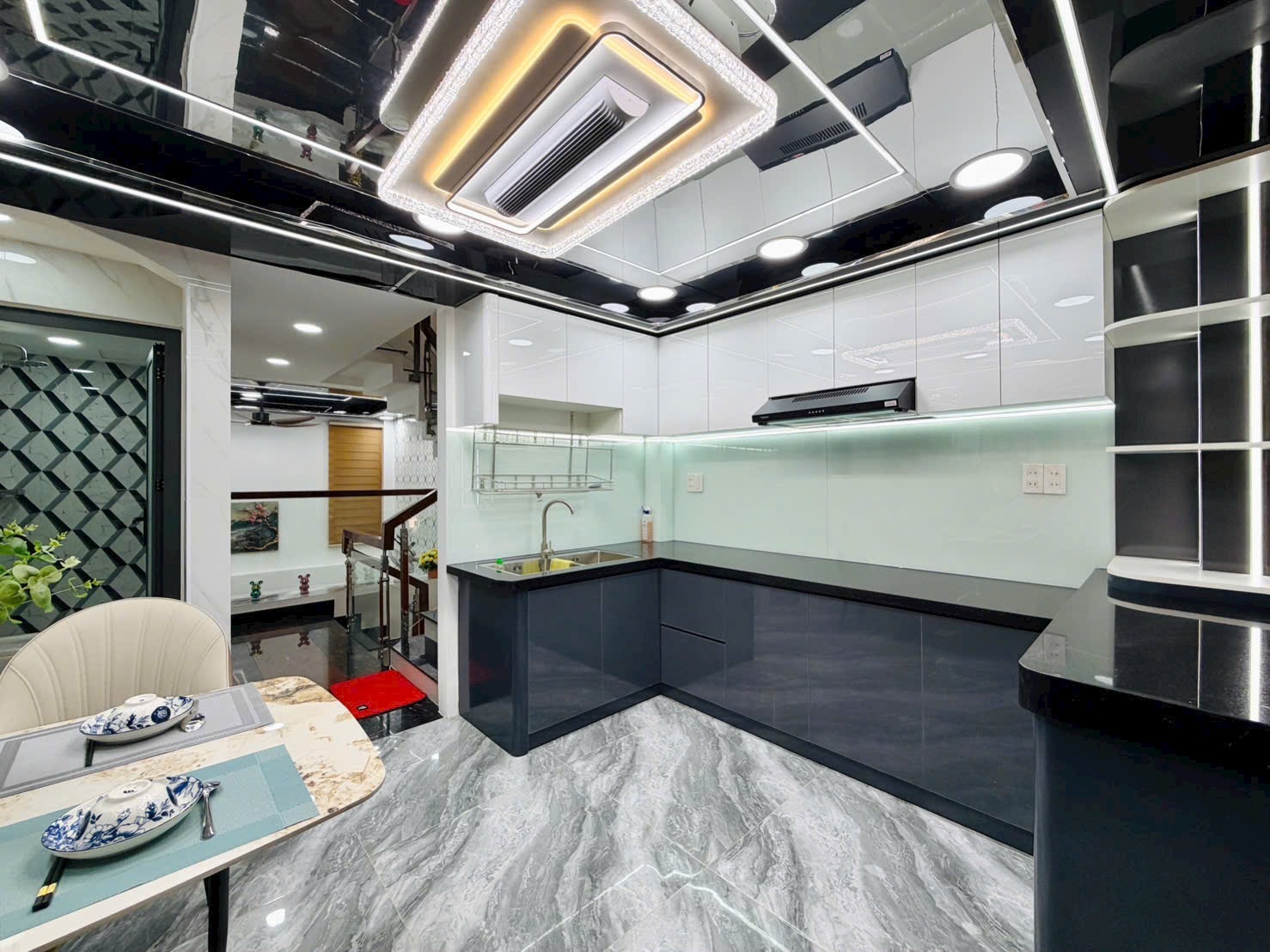 - Phòng bếp bố trí khoa học, tủ bếp trên dưới ốp đá toàn phần, tạo không gian nấu nướng tiện nghi và thẩm mỹ.