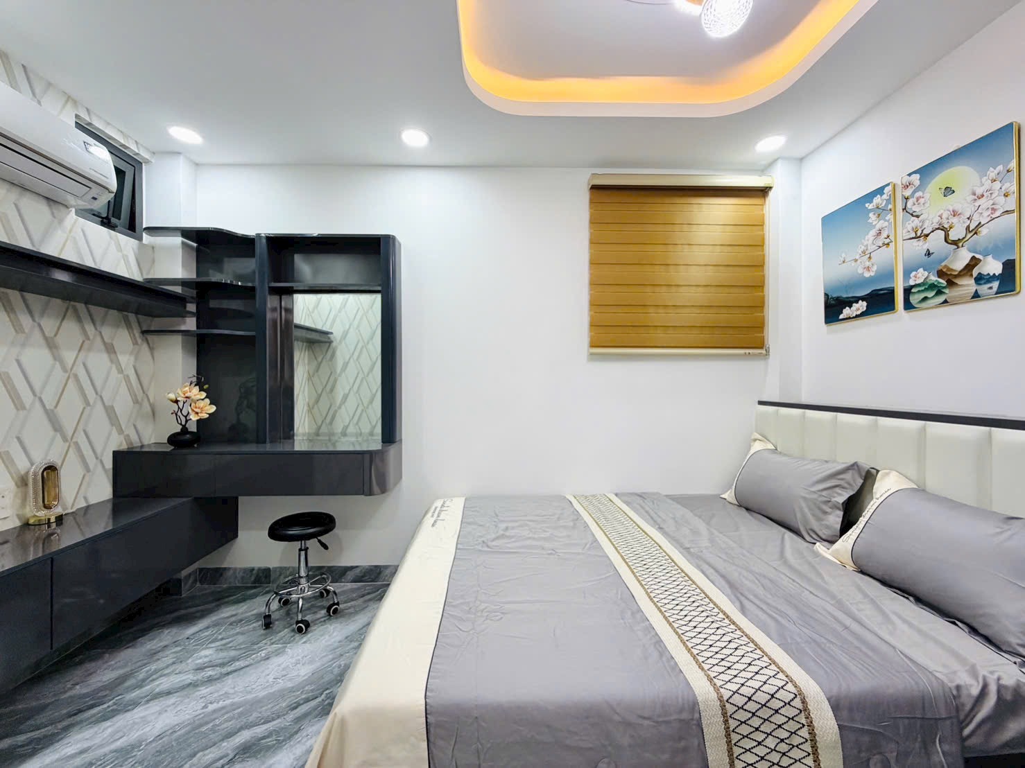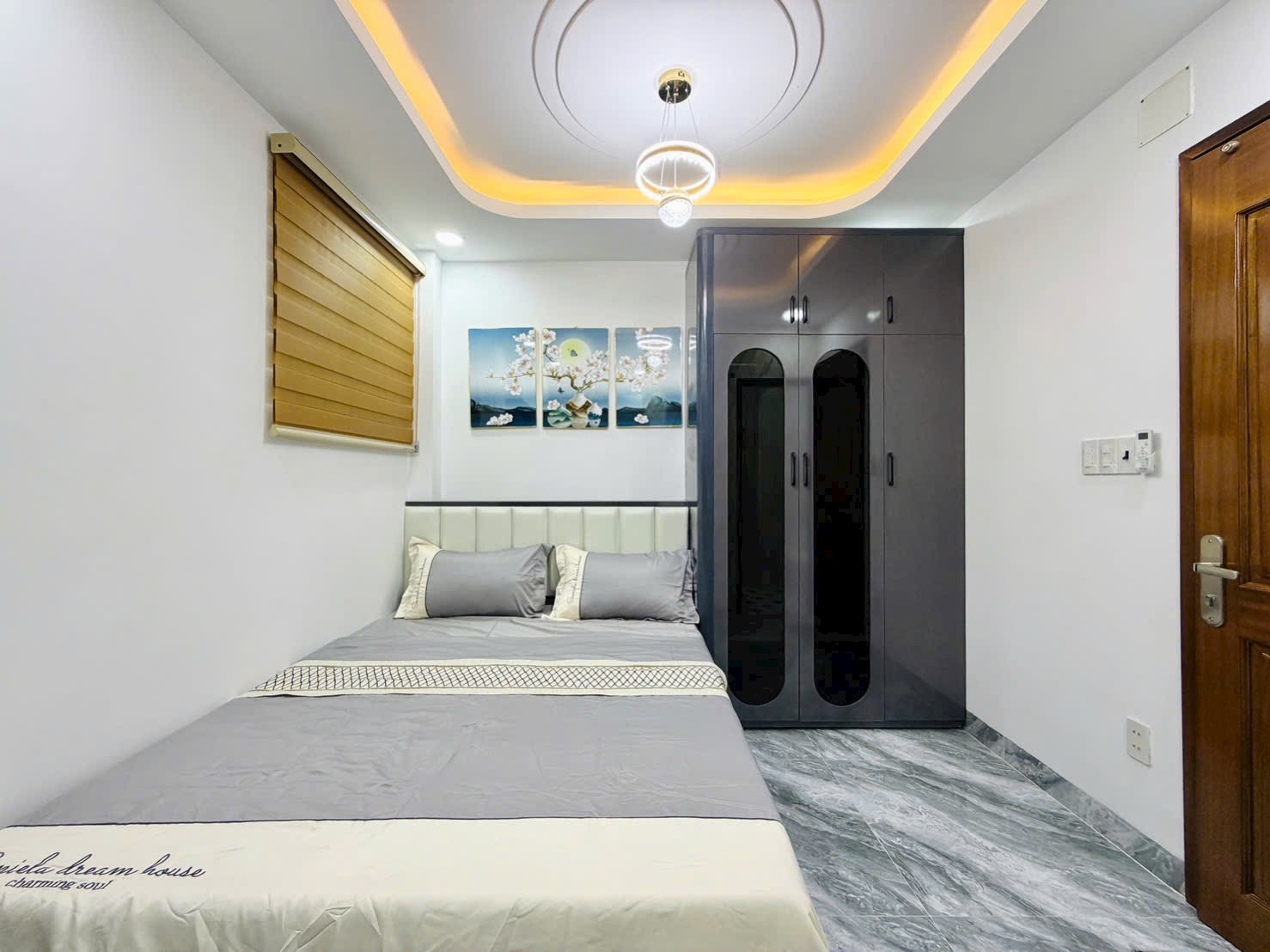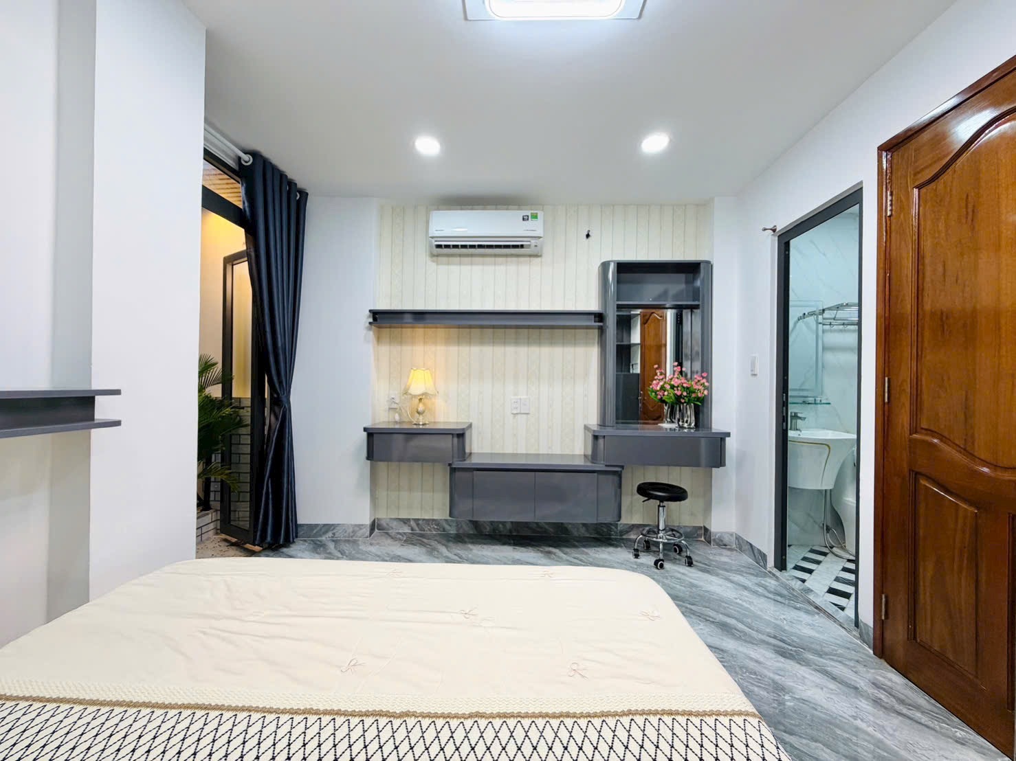 - Phòng ngủ được cải tạo lại với gam màu nhẹ nhàng, trang bị sẵn nội thất: giường, tủ, rèm, máy lạnh.