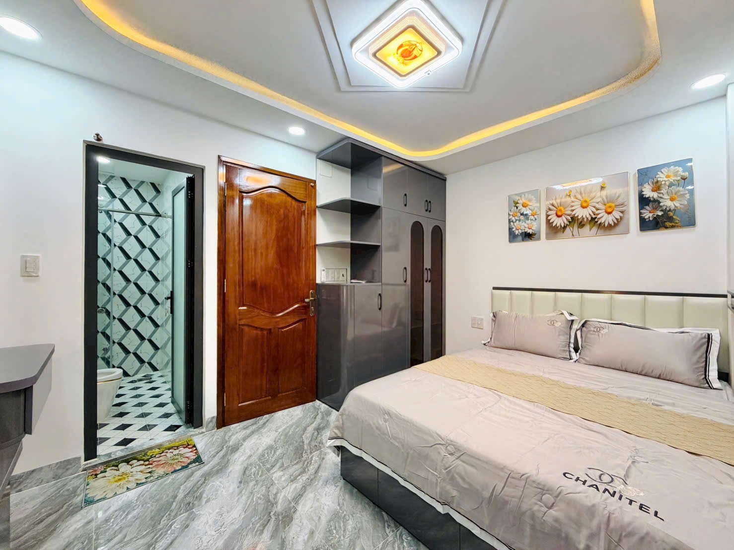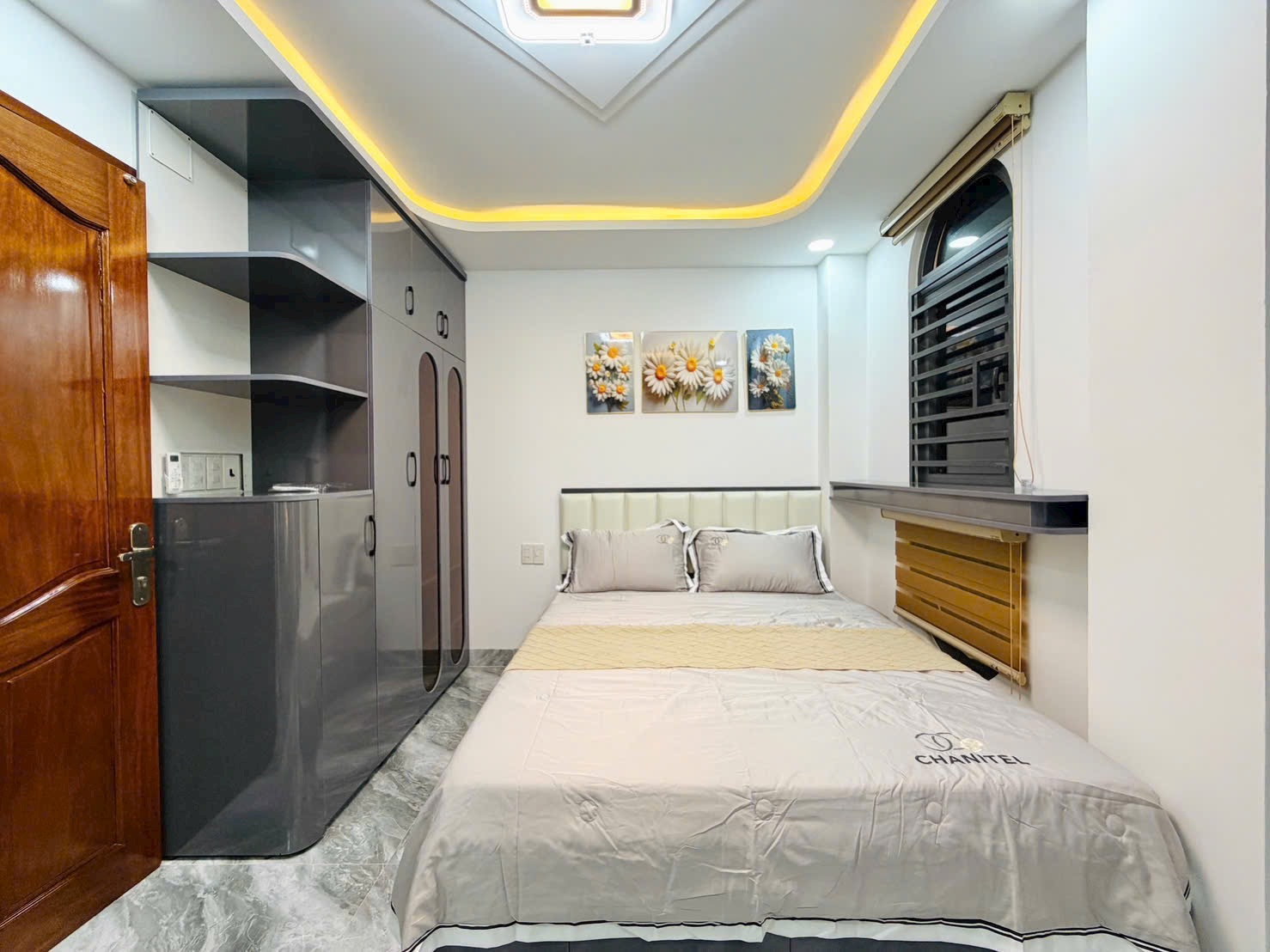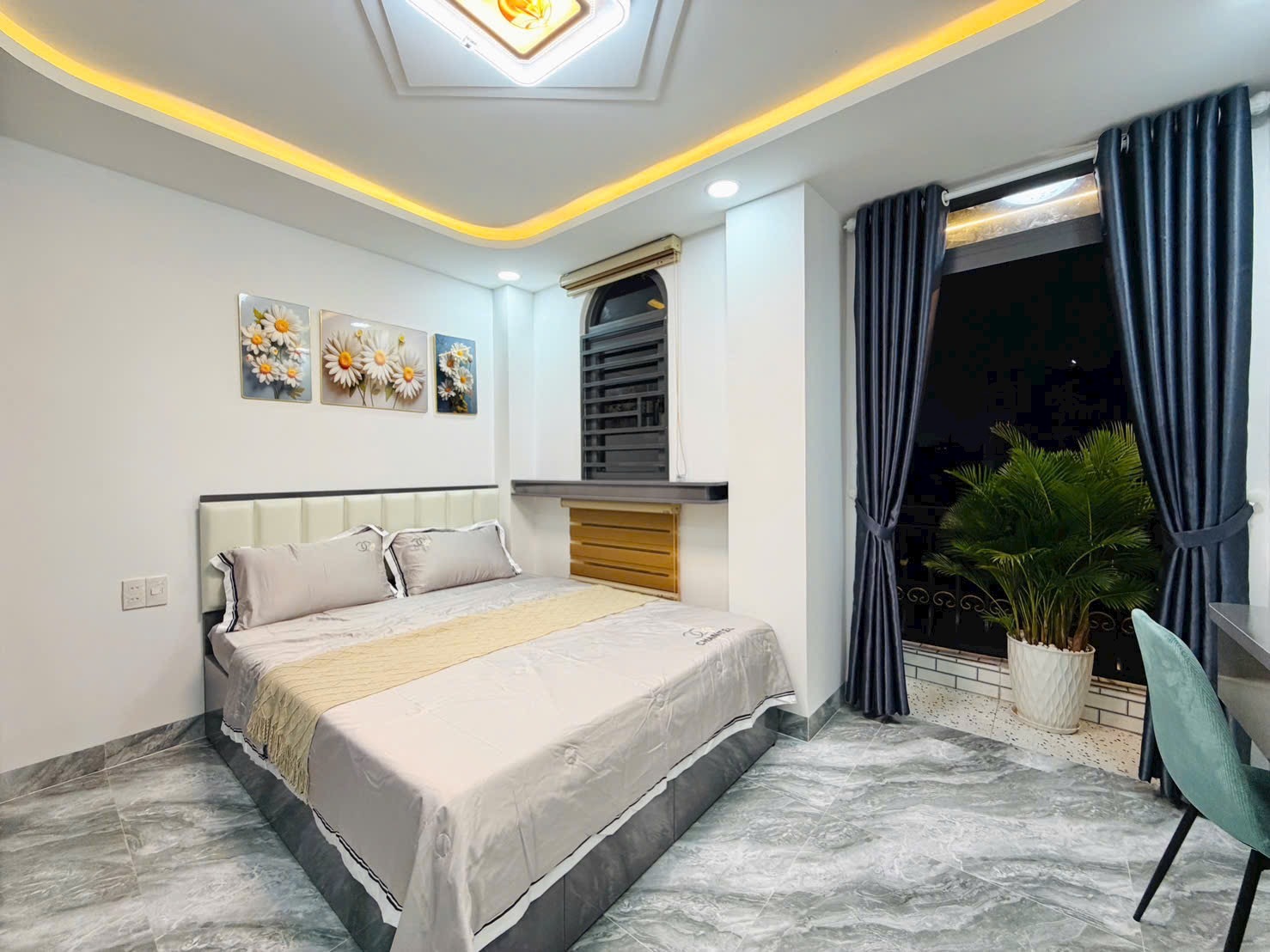 - Phòng ngủ được cải tạo lại với gam màu nhẹ nhàng, trang bị sẵn nội thất: giường, tủ, rèm, máy lạnh.