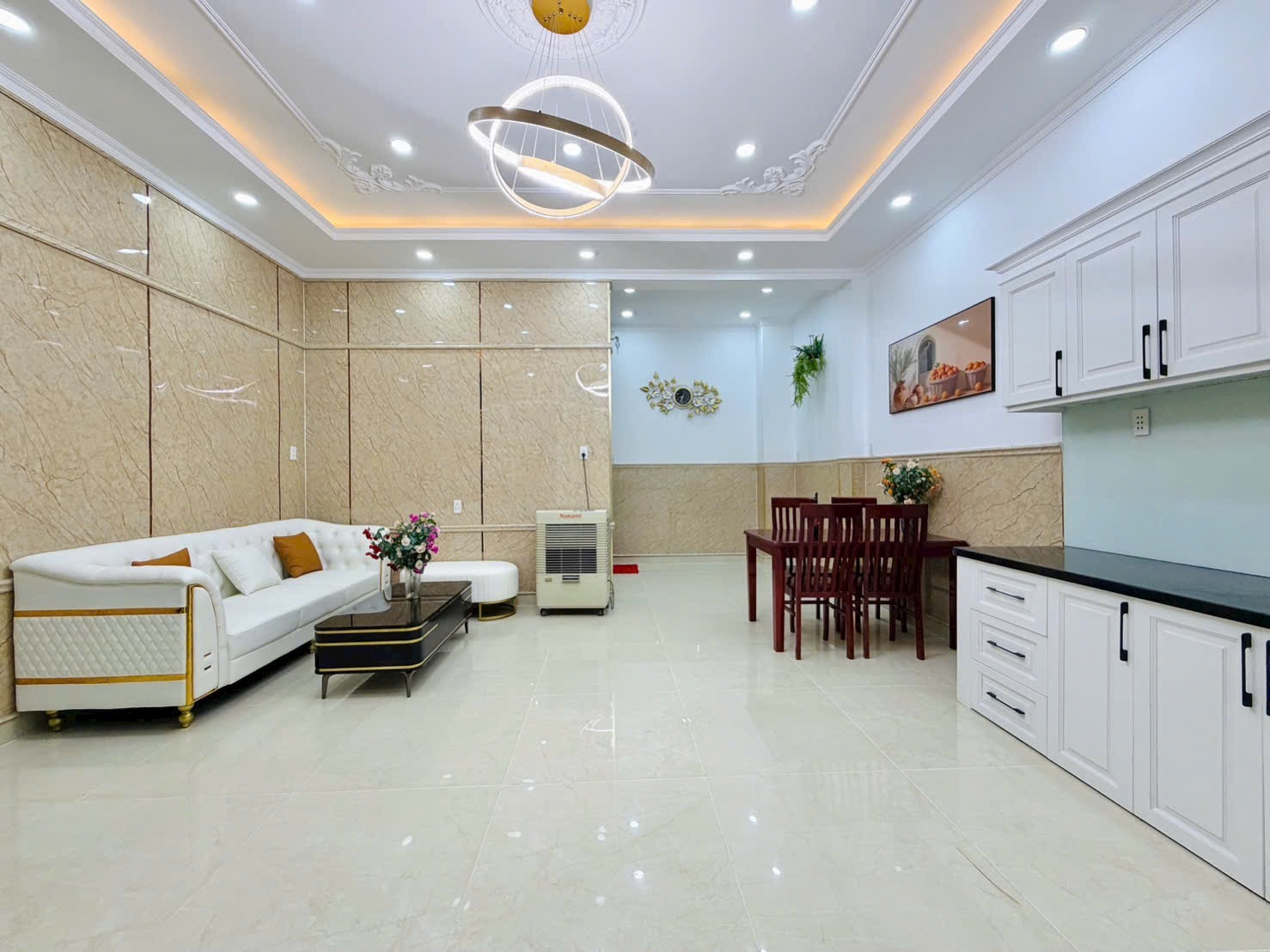 Phòng Khách Sang Trọng: Tường ốp tấm PVC vân đá cao cấp màu be/nude, kết hợp với sofa bọc da trắng/kem nhấn vàng gold, bàn trà mặt đen bóng tạo nên một không gian tiếp khách cực kỳ đẳng cấp. Ánh sáng vàng hắt trần cùng đèn chùm nghệ thuật hình vòng tròn hiện đại là điểm nhấn hoàn hảo.