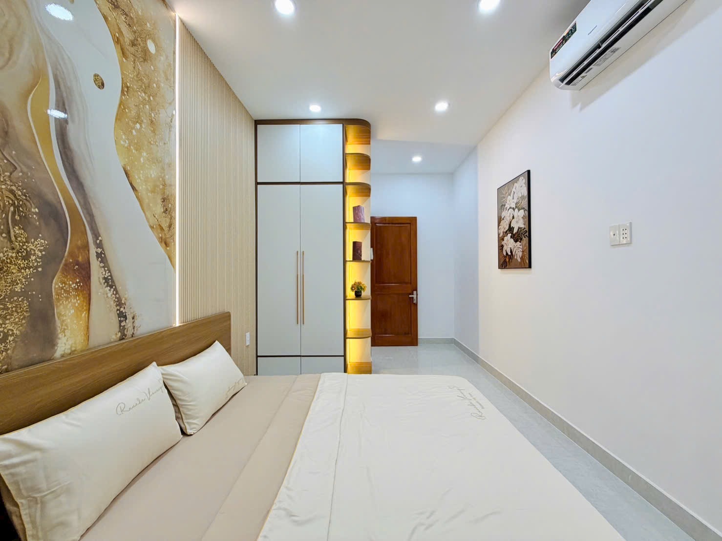 Phòng Ngủ Master: Thiết kế tông màu be/trắng, điểm nhấn là bức tranh nghệ thuật lớn sau đầu giường với họa tiết vàng gold lượn sóng. Tủ quần áo lớn, bàn trang điểm hiện đại.