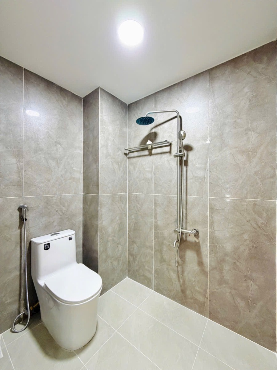 Các phòng vệ sinh được ốp gạch men cao cấp, tông màu xám vân đá sang trọng, sạch sẽ. Đặc biệt, trang bị đầy đủ bồn cầu khối hiện đại, vòi sen mưa (rain shower) cùng các phụ kiện inox cao cấp, mang lại trải nghiệm thư giãn tuyệt đối.