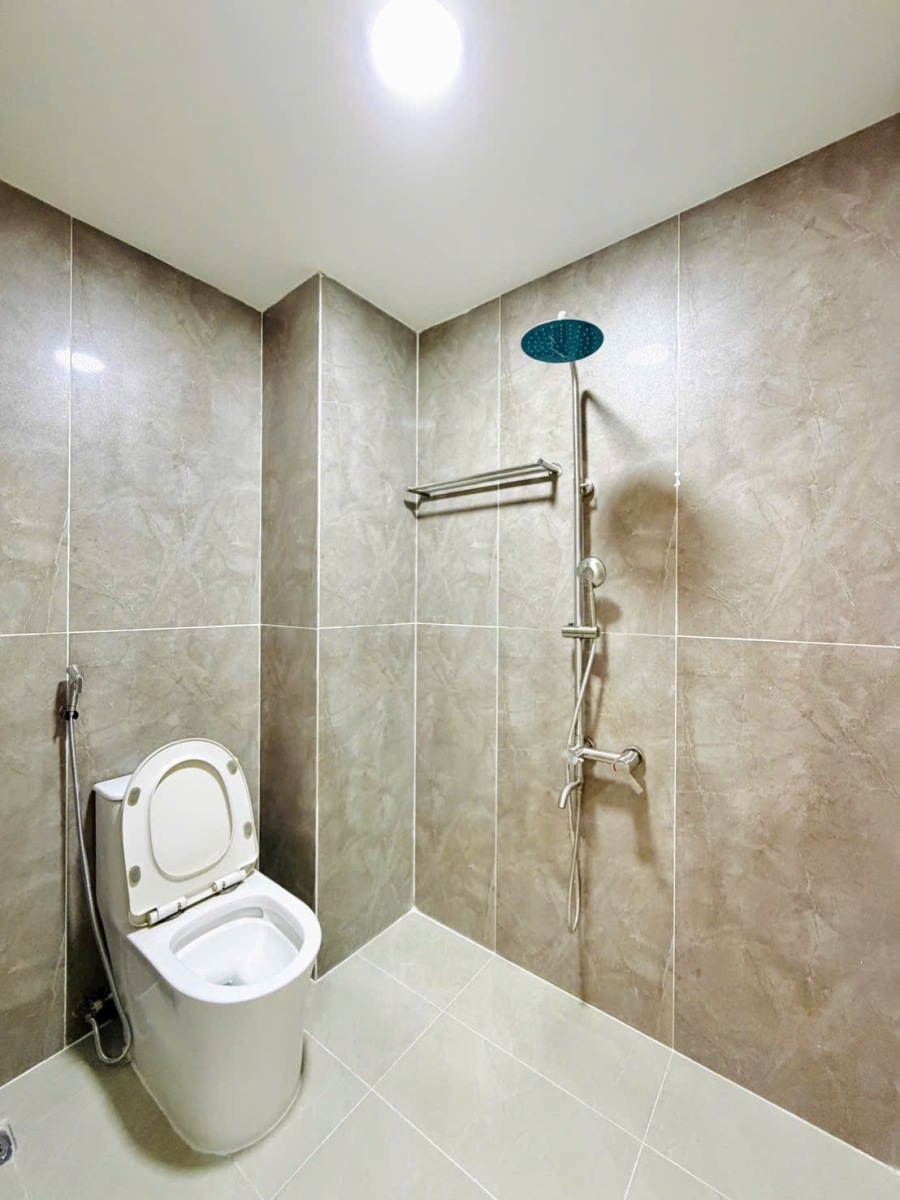 Các phòng vệ sinh được ốp gạch men cao cấp, tông màu xám vân đá sang trọng, sạch sẽ. Đặc biệt, trang bị đầy đủ bồn cầu khối hiện đại, vòi sen mưa (rain shower) cùng các phụ kiện inox cao cấp, mang lại trải nghiệm thư giãn tuyệt đối.
