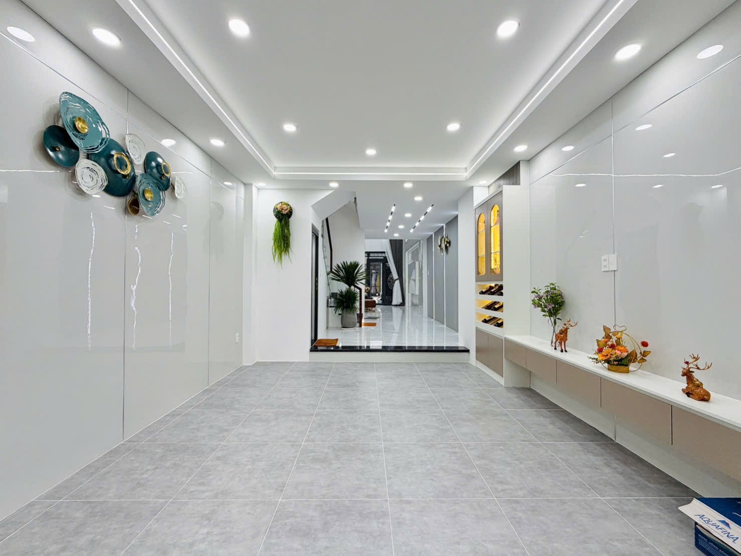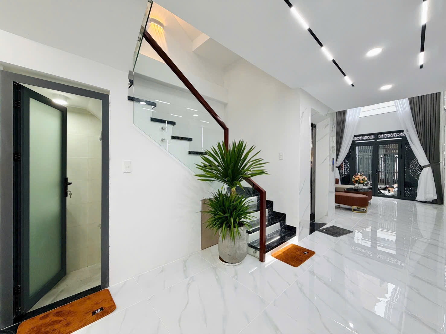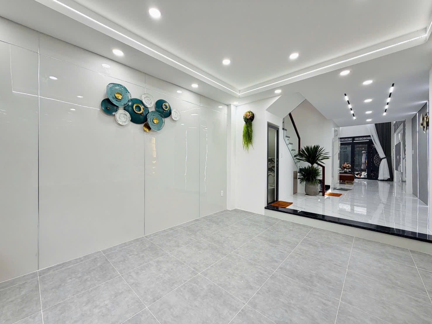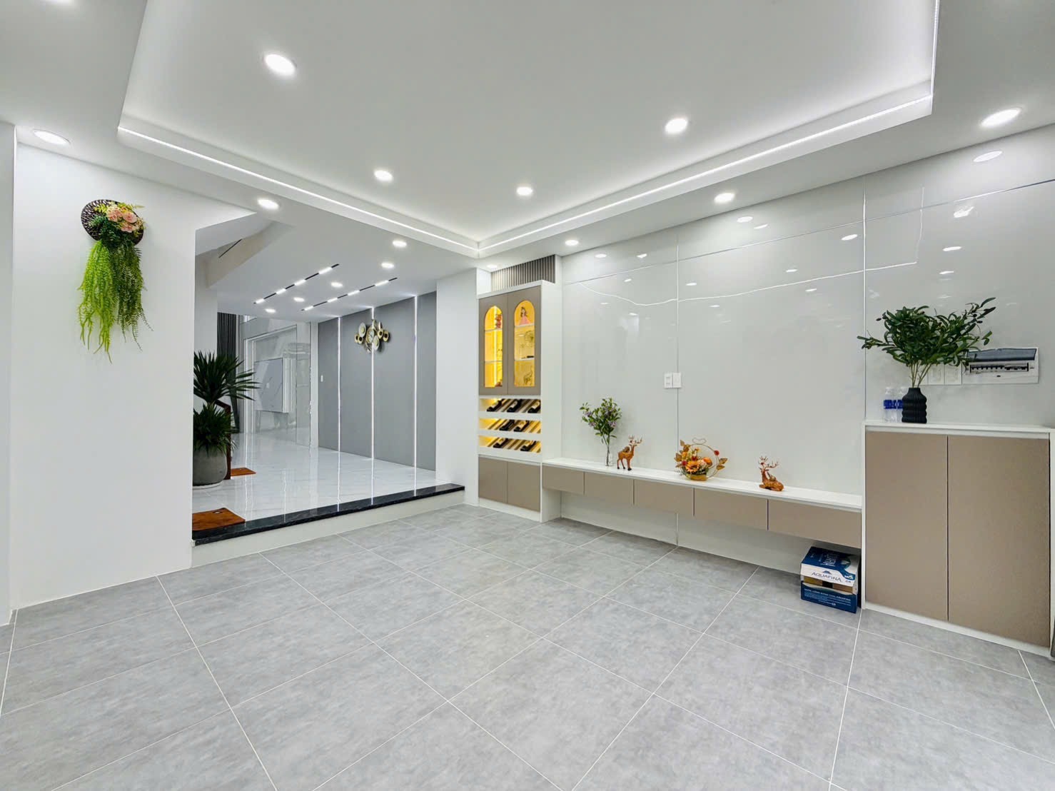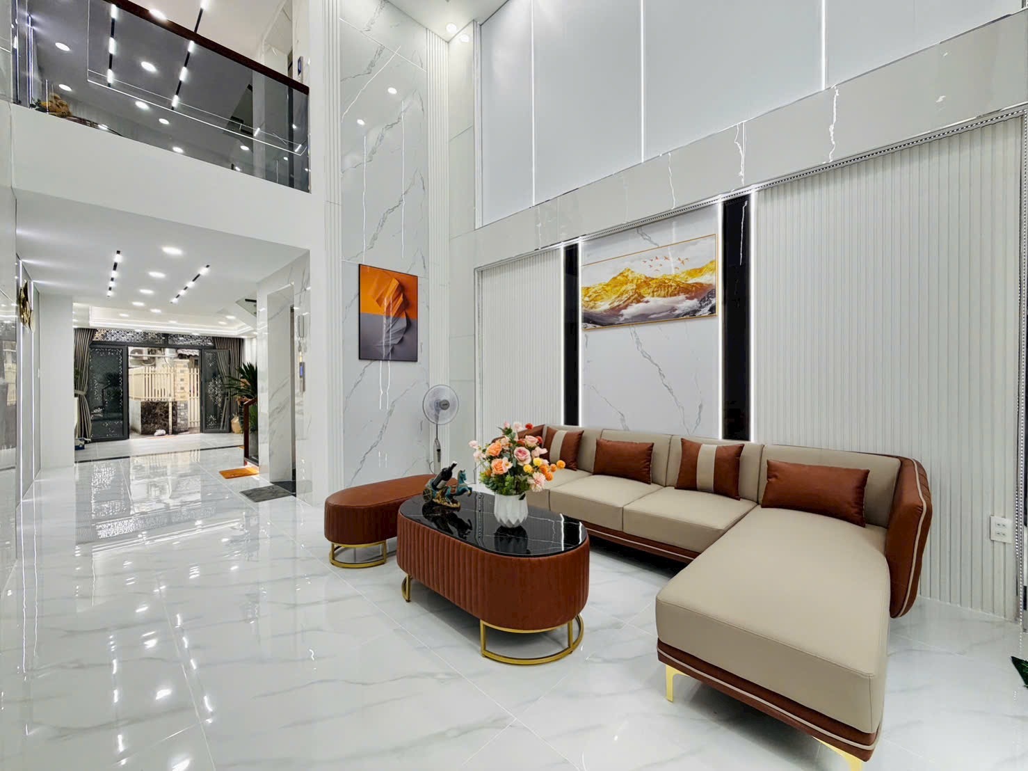 Tầng trệt được thiết kế phòng khách thông tầng cao thoáng, sàn lát đá bóng mờ, đèn led âm trần tinh tế.