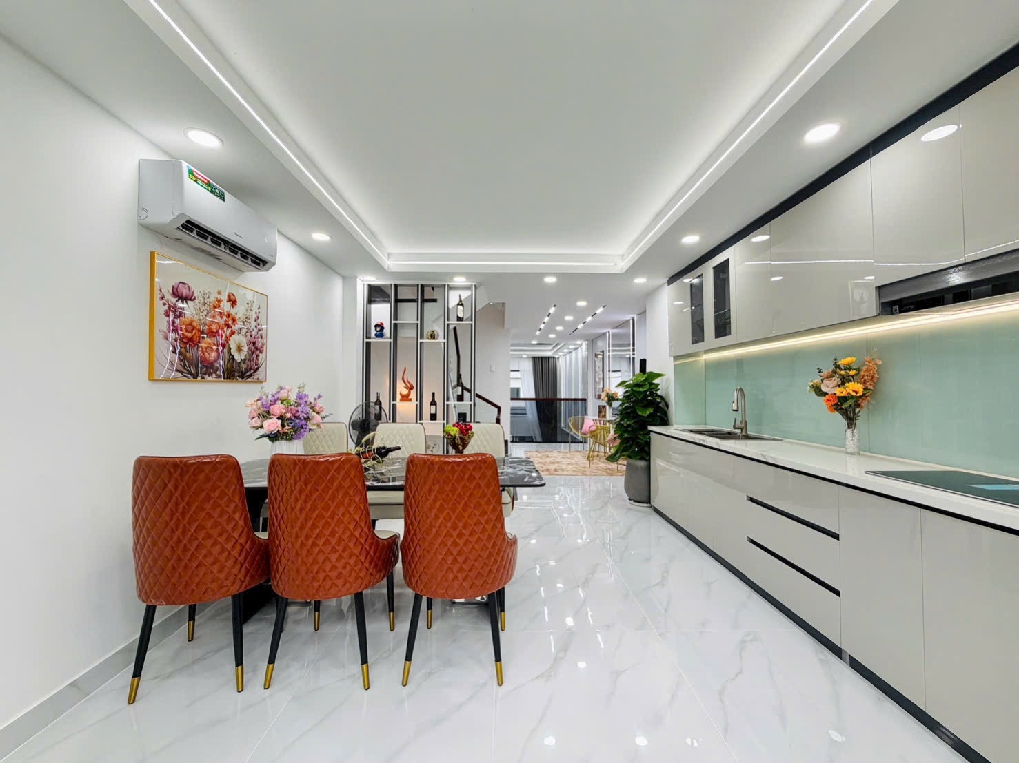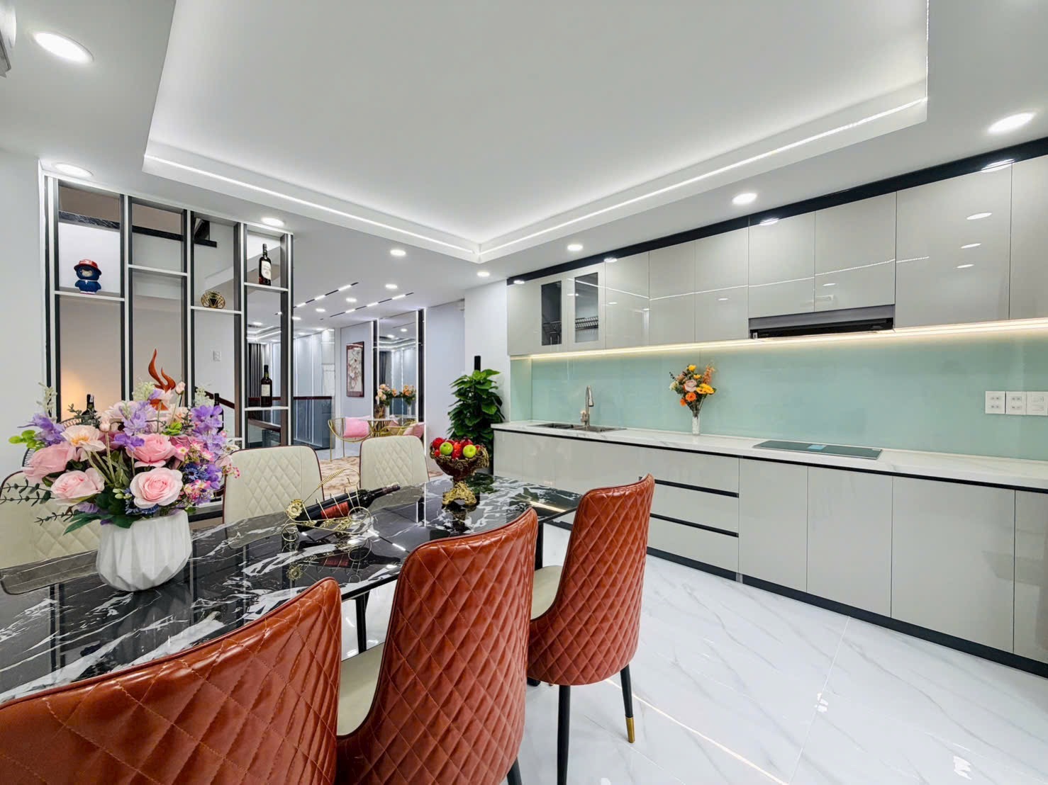 Phòng bếp rộng rãi, trang bị tủ bếp acrylic bóng gương, mặt đá tự nhiên, bàn ăn sang trọng.