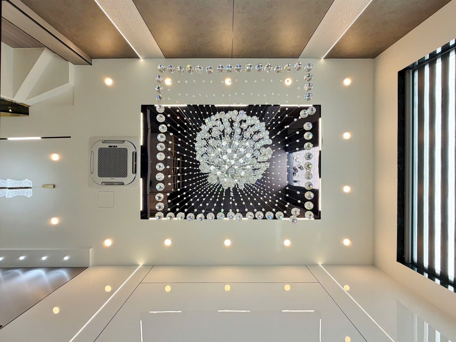 Phòng khách sang trọng, trần cao, đèn led âm trần kết hợp mảng tường 3D và hệ kính phản sáng cực đẹp.