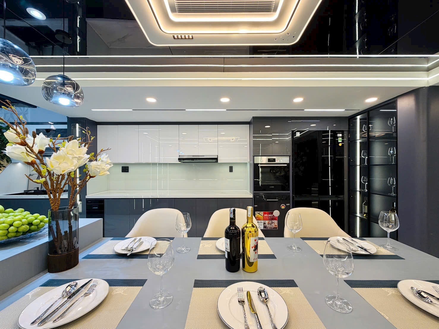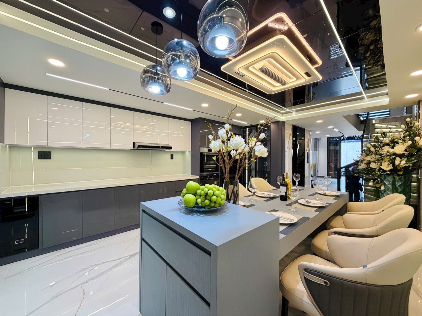 Khu vực bếp ăn rộng rãi, trang bị đầy đủ tủ bếp trên dưới, bàn đảo, bộ bàn ghế cao cấp và hệ thống chiếu sáng ấn tượng.