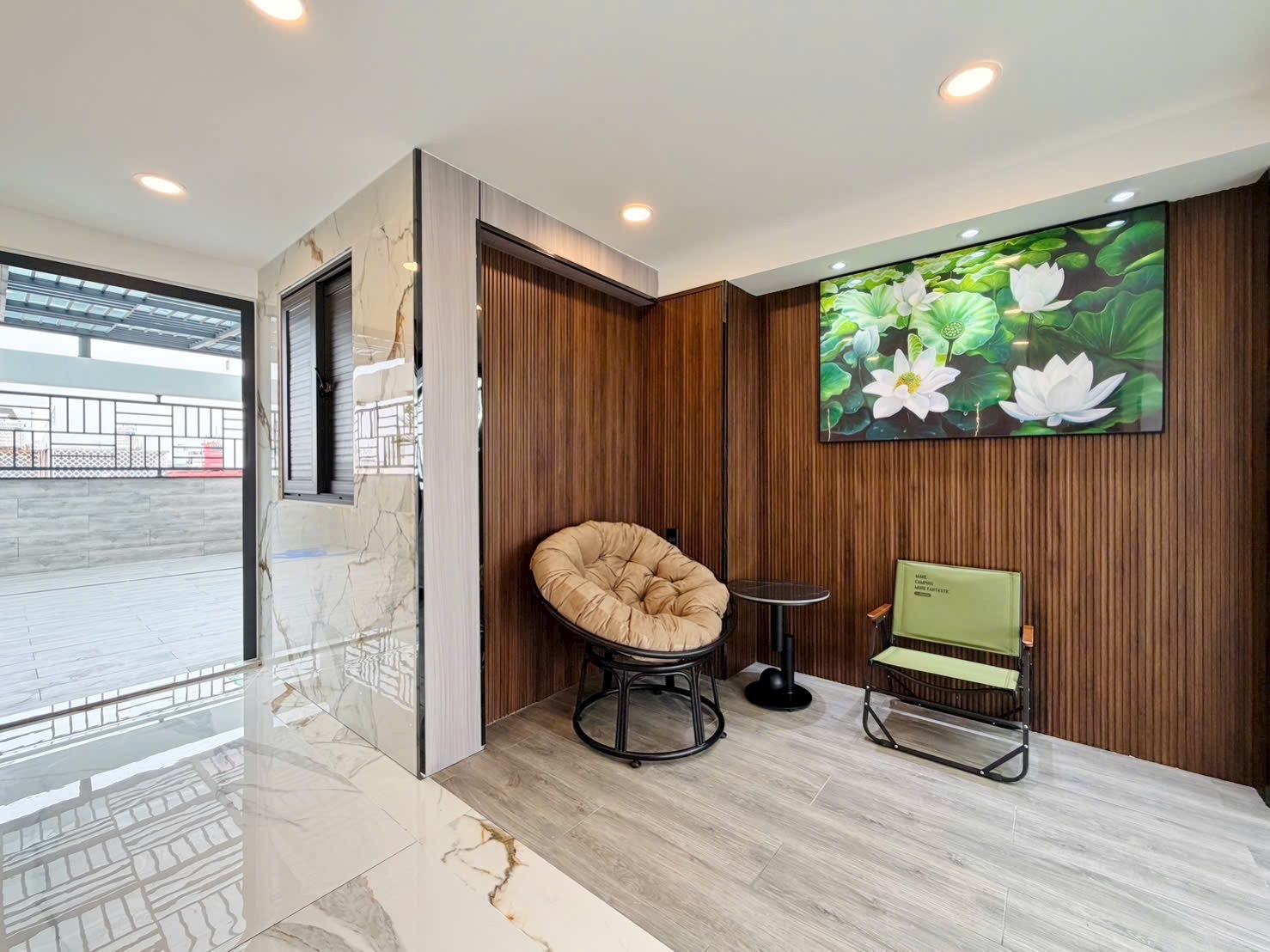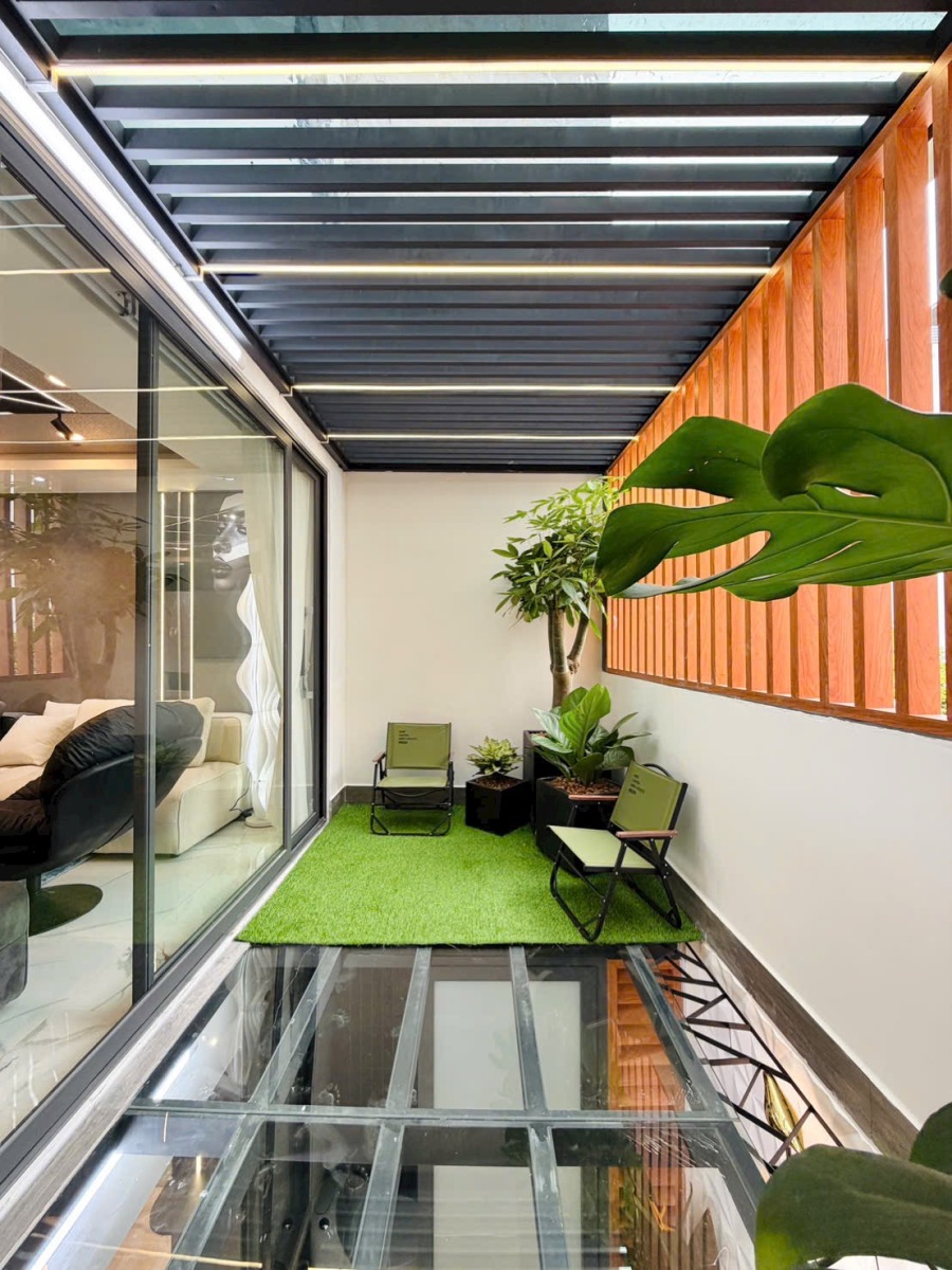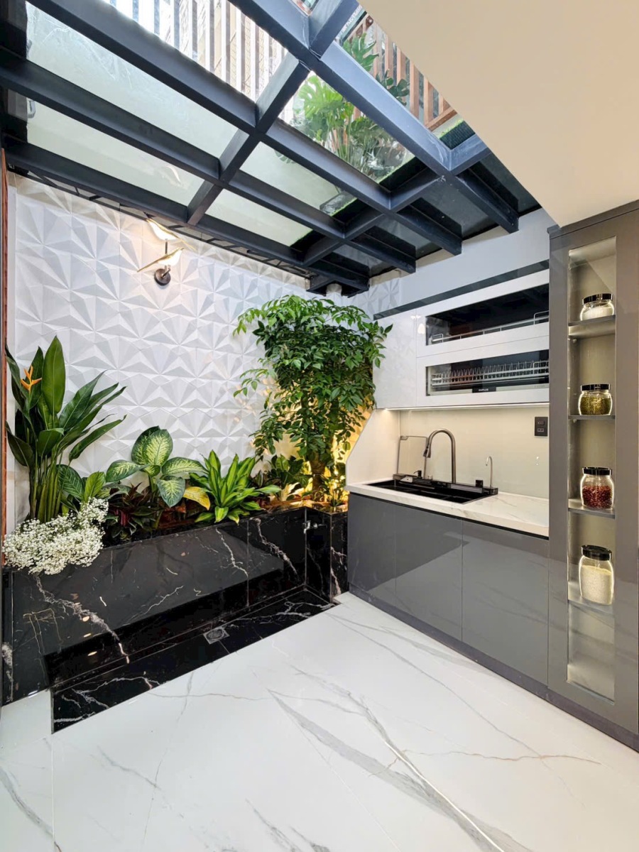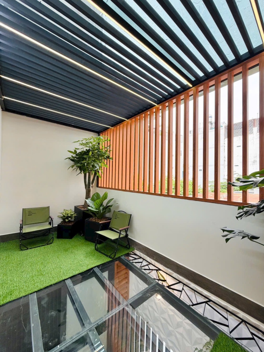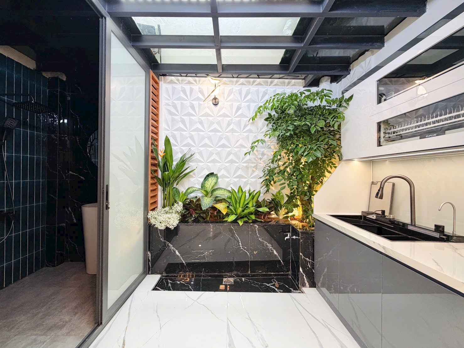 Điểm nhấn của căn nhà là khu tiểu cảnh xanh mát, giếng trời lấy sáng tự nhiên và sân thượng rộng rãi được thiết kế thành không gian thư giãn, tiệc BBQ cuối tuần.