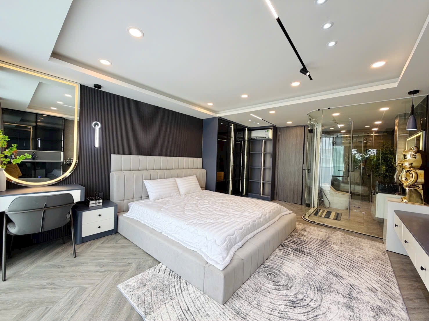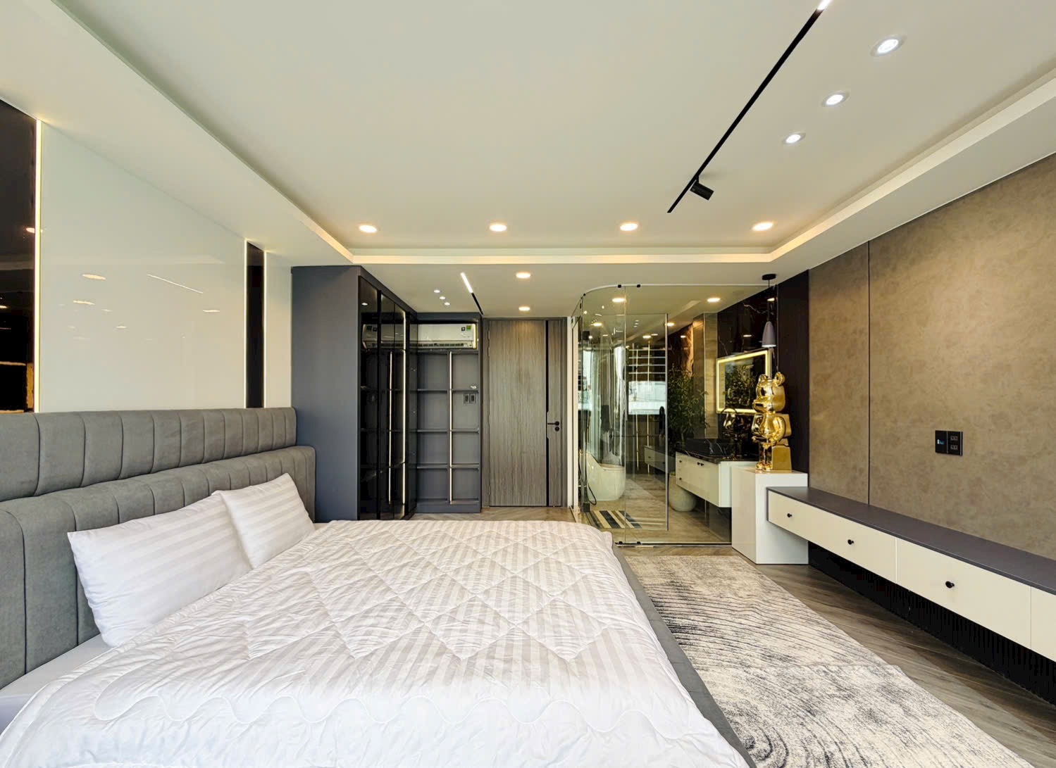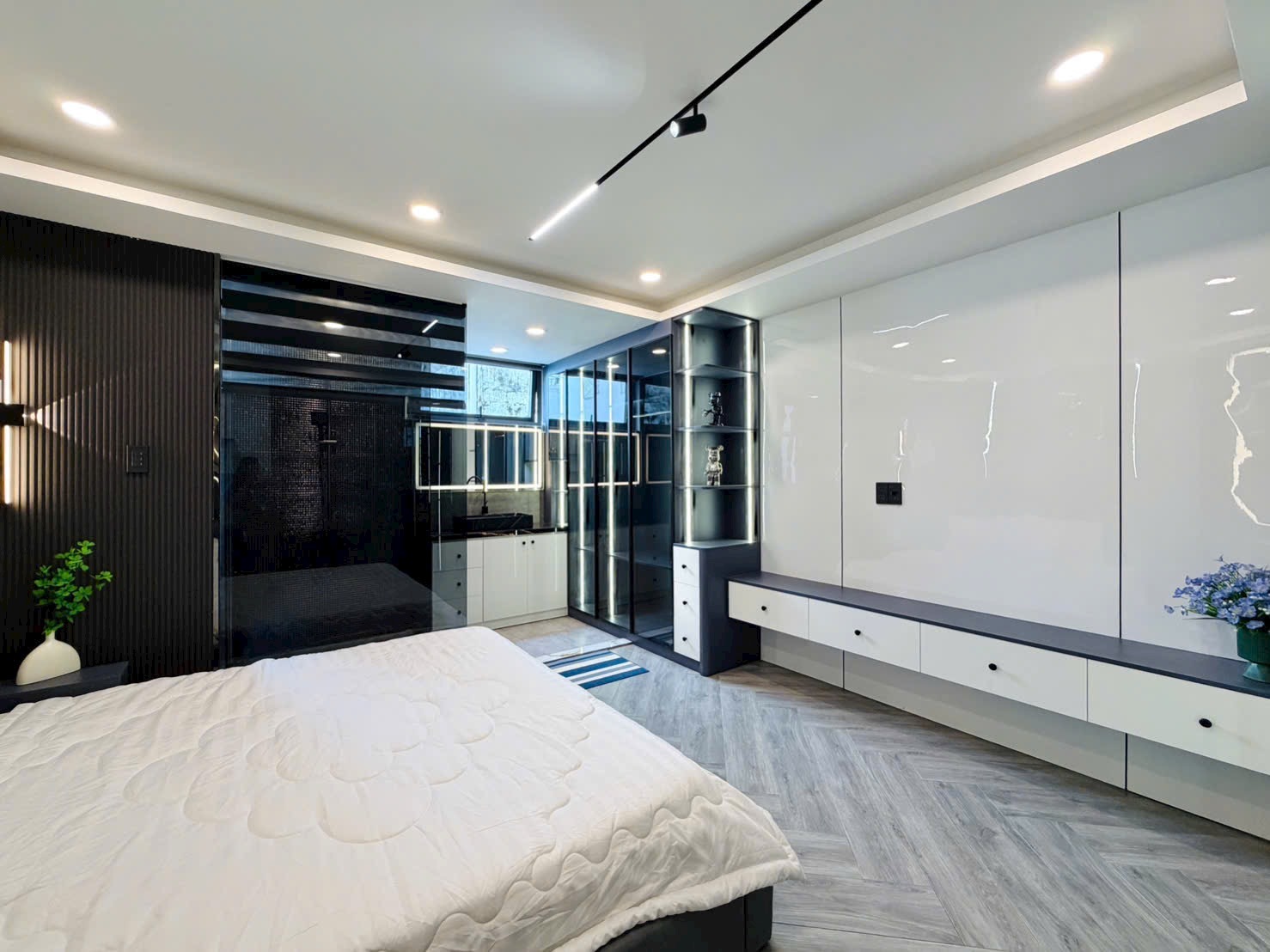 Phòng ngủ rộng, có phòng tắm riêng khép kín, sàn gỗ chống trượt, cửa kính cách âm.