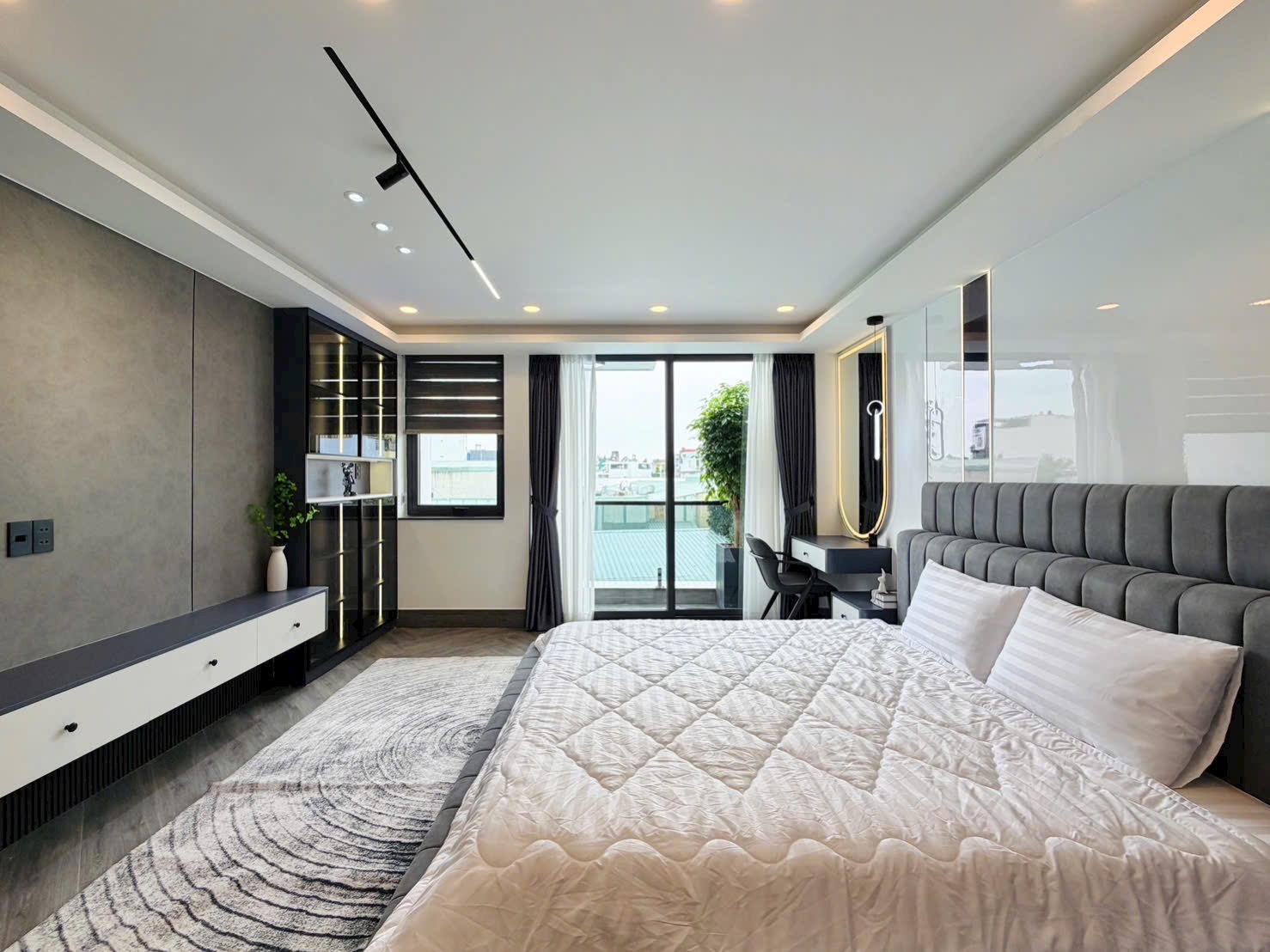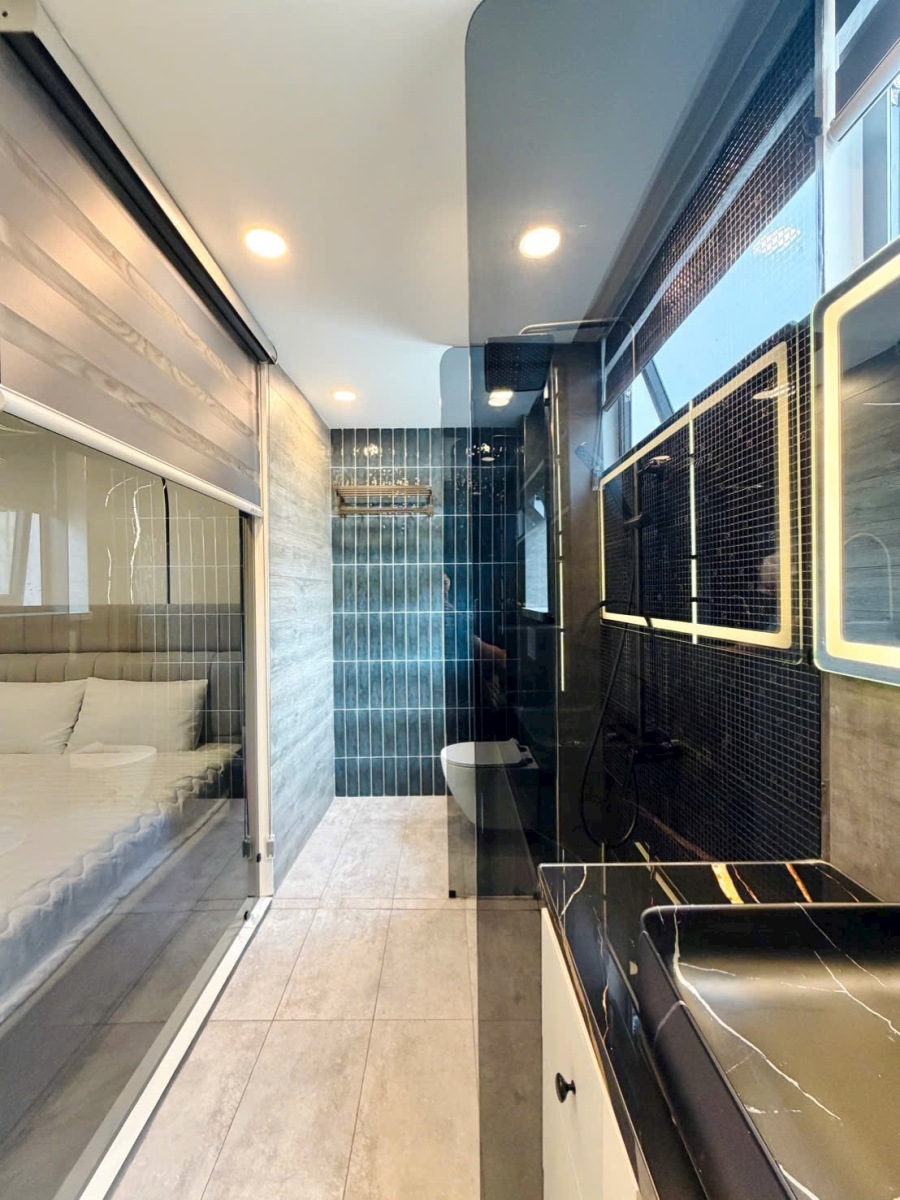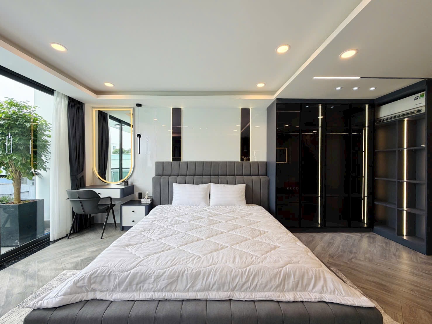 Phòng ngủ rộng, có phòng tắm riêng khép kín, sàn gỗ chống trượt, cửa kính cách âm.