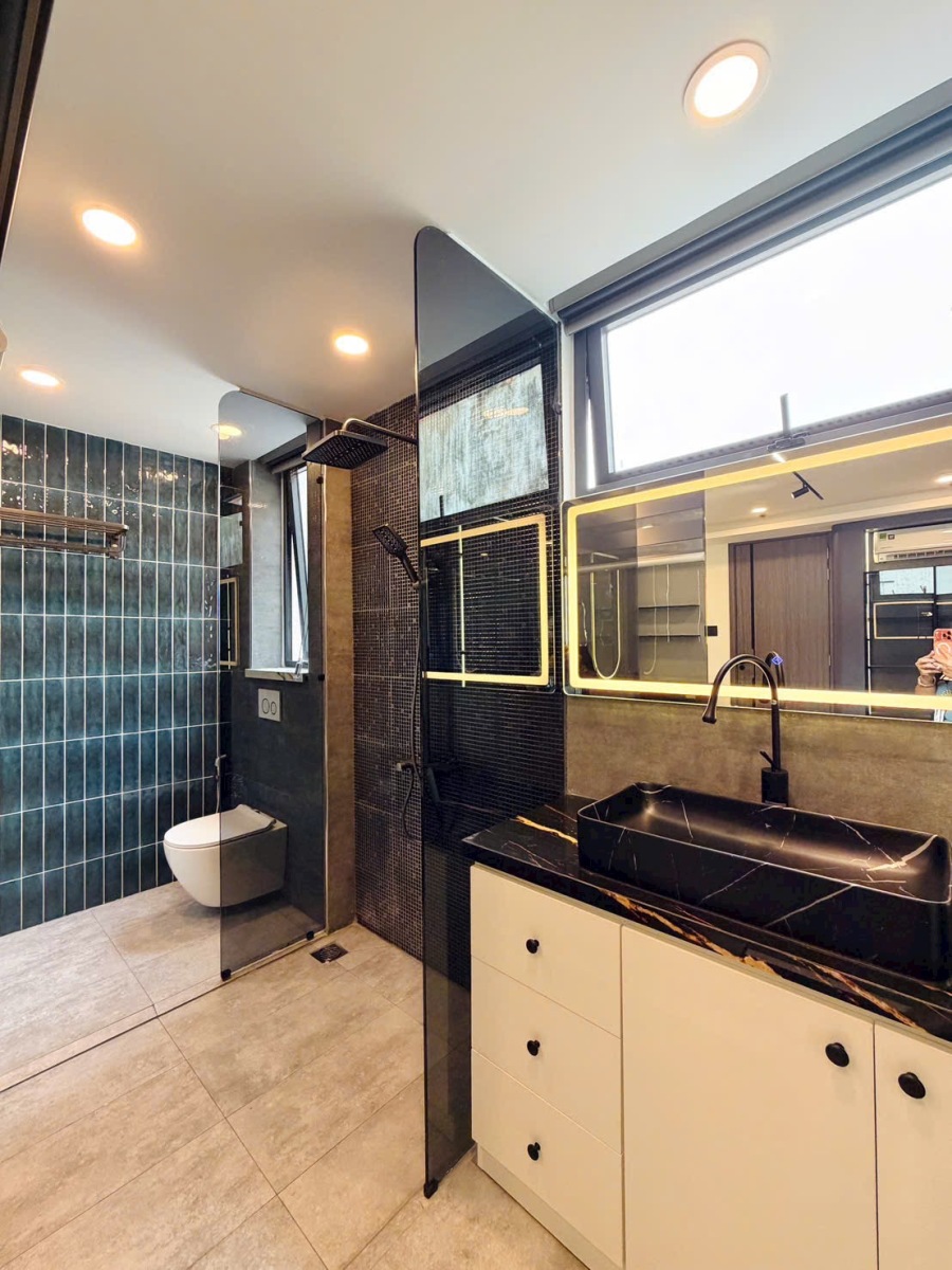 Phòng tắm được ốp đá tự nhiên, trang bị sen cây nóng lạnh, kính cường lực cao cấp.