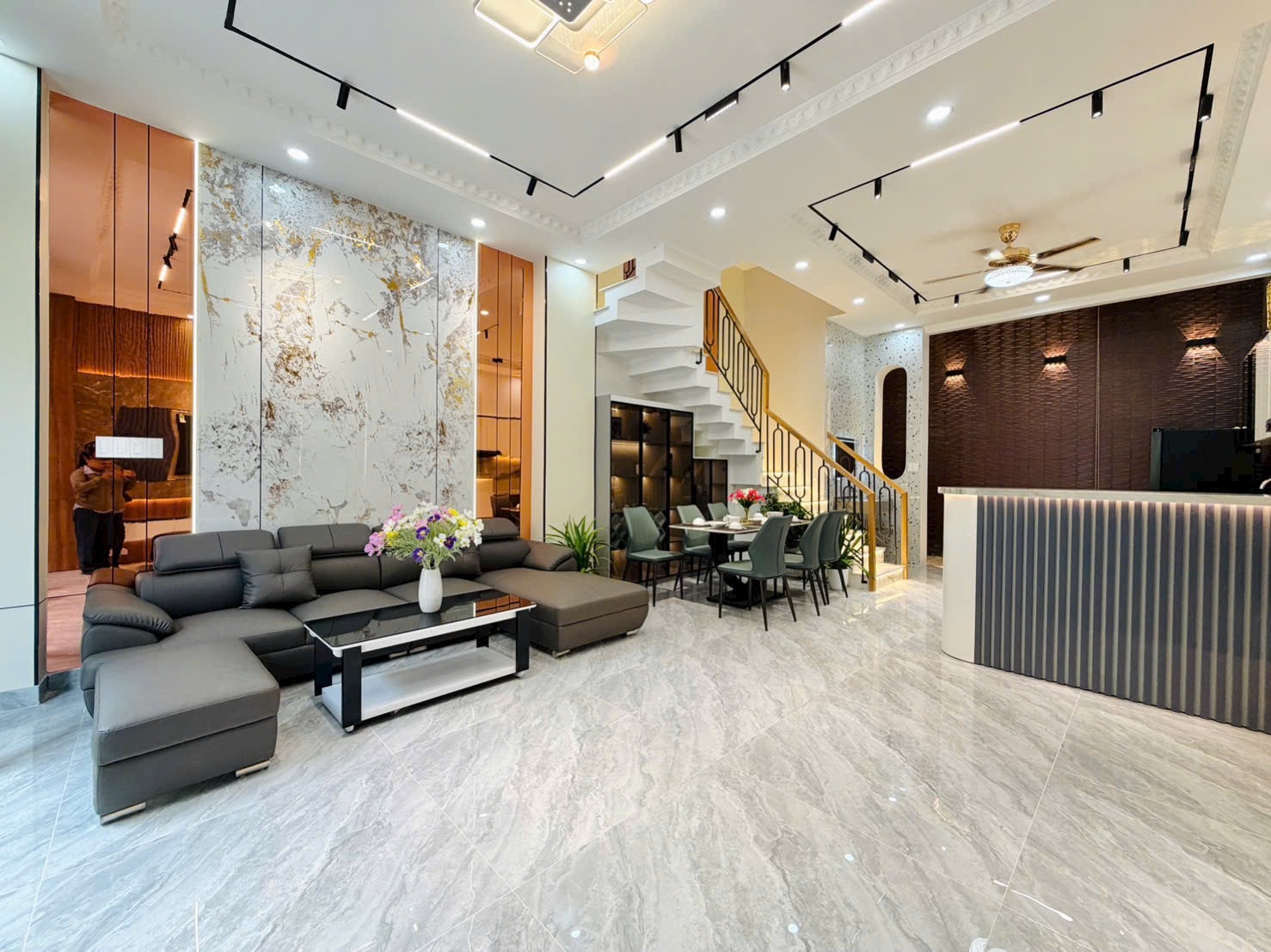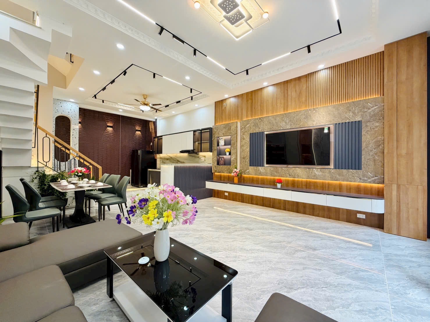 Không gian phòng khách rộng, thiết kế mở liên thông với bếp và bàn ăn, mang đến cảm giác ấm cúng, tiện nghi.