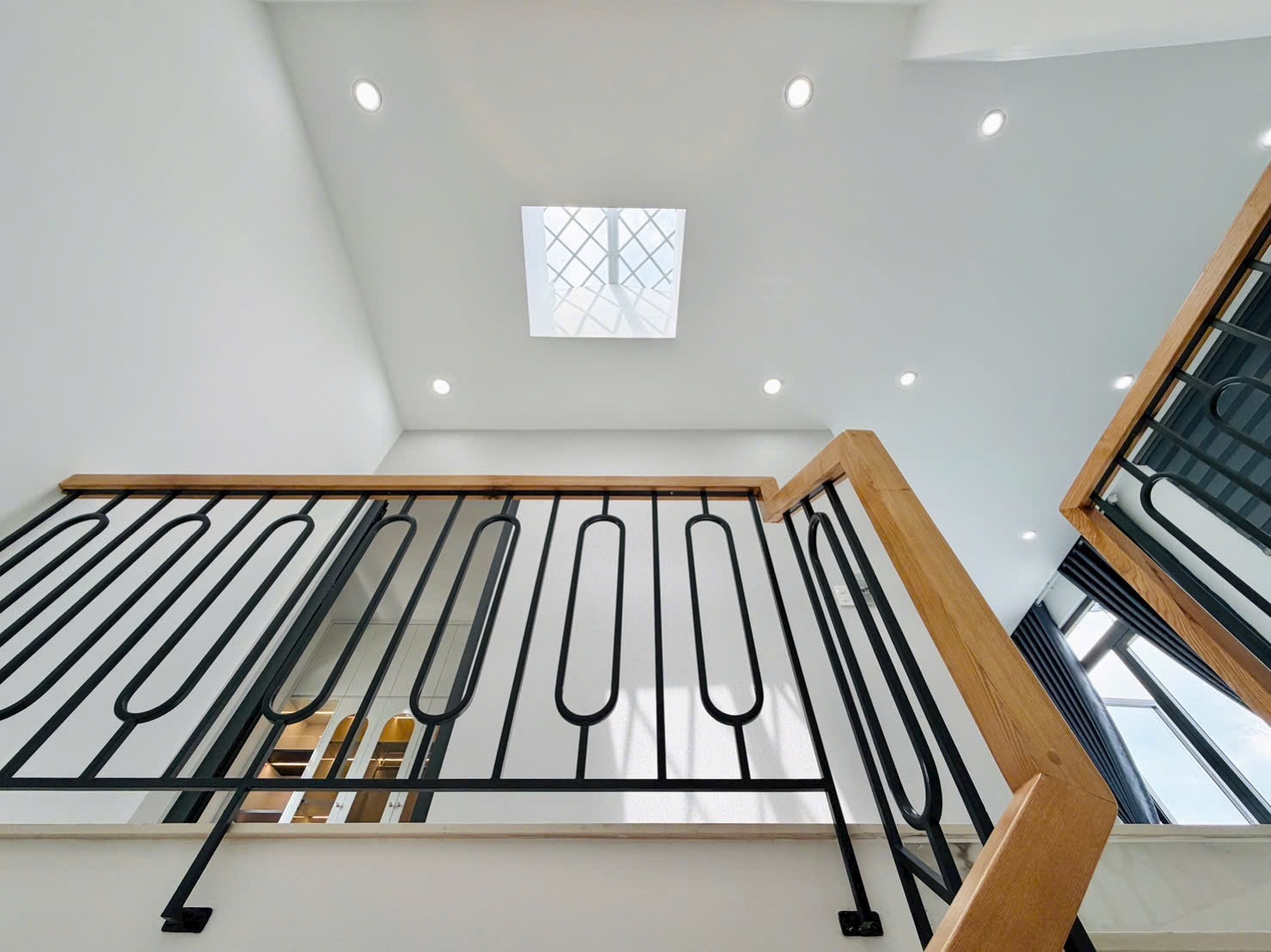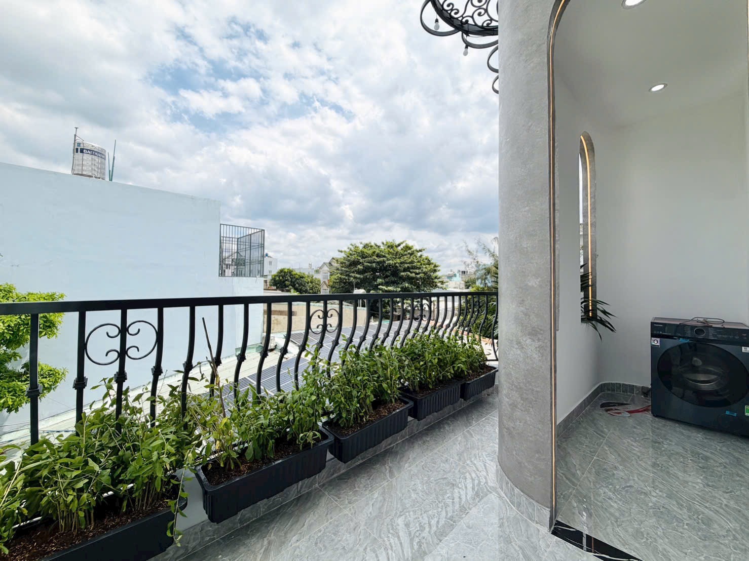 Ngôi nhà nổi bật với mặt tiền hiện đại, tone trắng tinh tế, lan can sắt mỹ thuật sang trọng.
